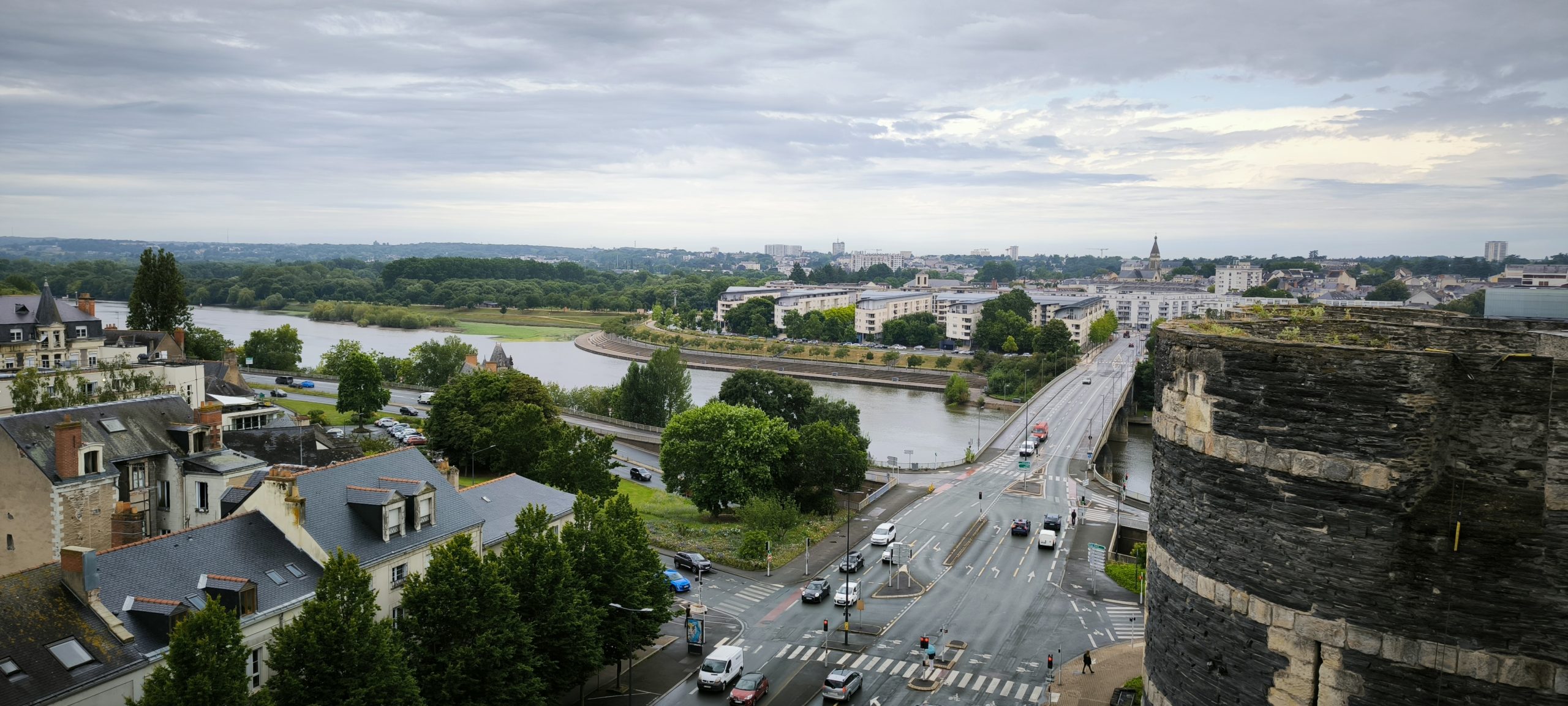 Angers n’était en haut de ma liste de visite, mais j’étais sur place alors autant en profiter. Et pas de bol, il pleuvait ce matin-là. Je me suis garée sur le grand parking le long du Bd Foulques Nerra (en face du château de l’autre côté du Maine). Et j’ai attendu. Je n’avais que le pont à traverser et à remonter jusqu’à l’entrée du château. Ce n’est pas loin du tout, mais vu la pluie, je ne voulais pas être trempée avant même d’y être arrivée. Je précise aussi que je n’ai fait que la visite du château et non de la ville.