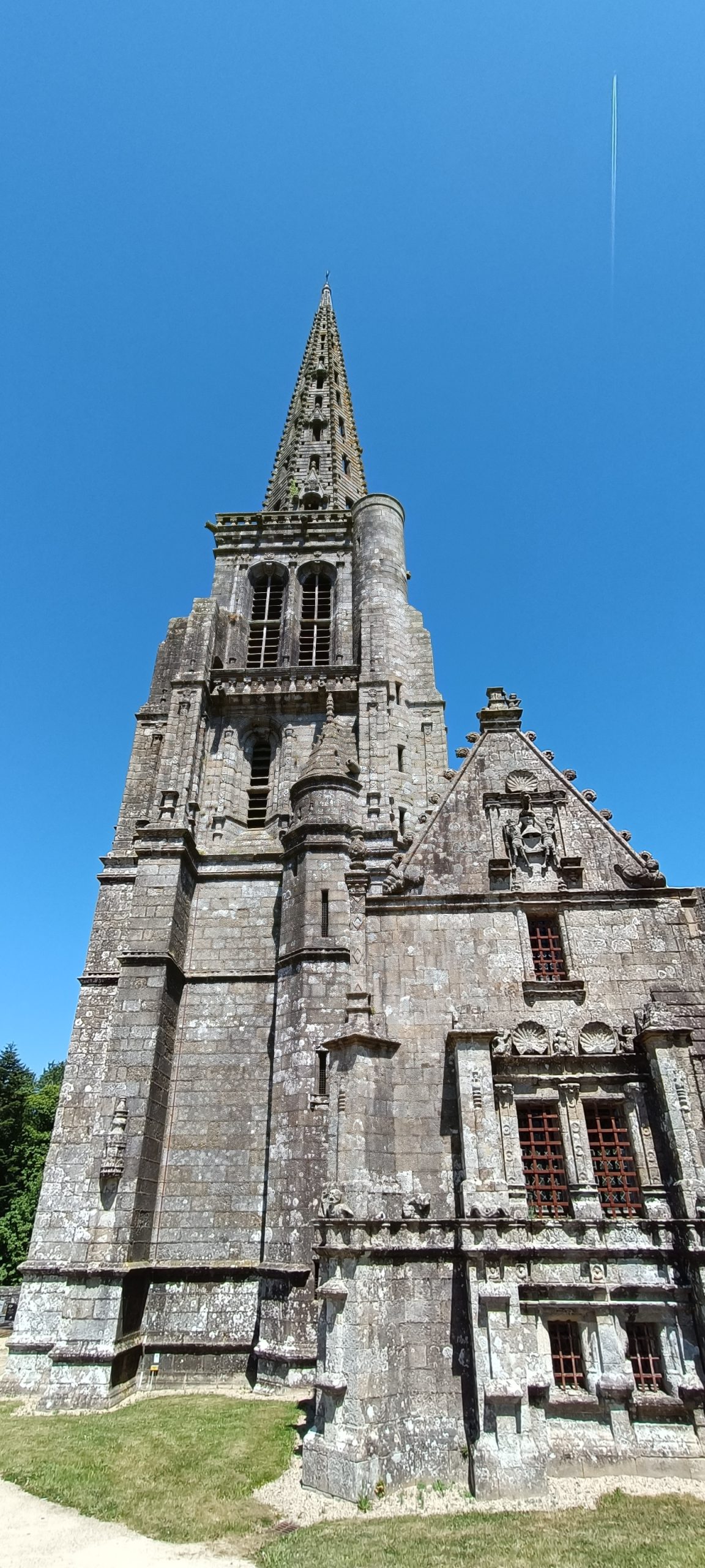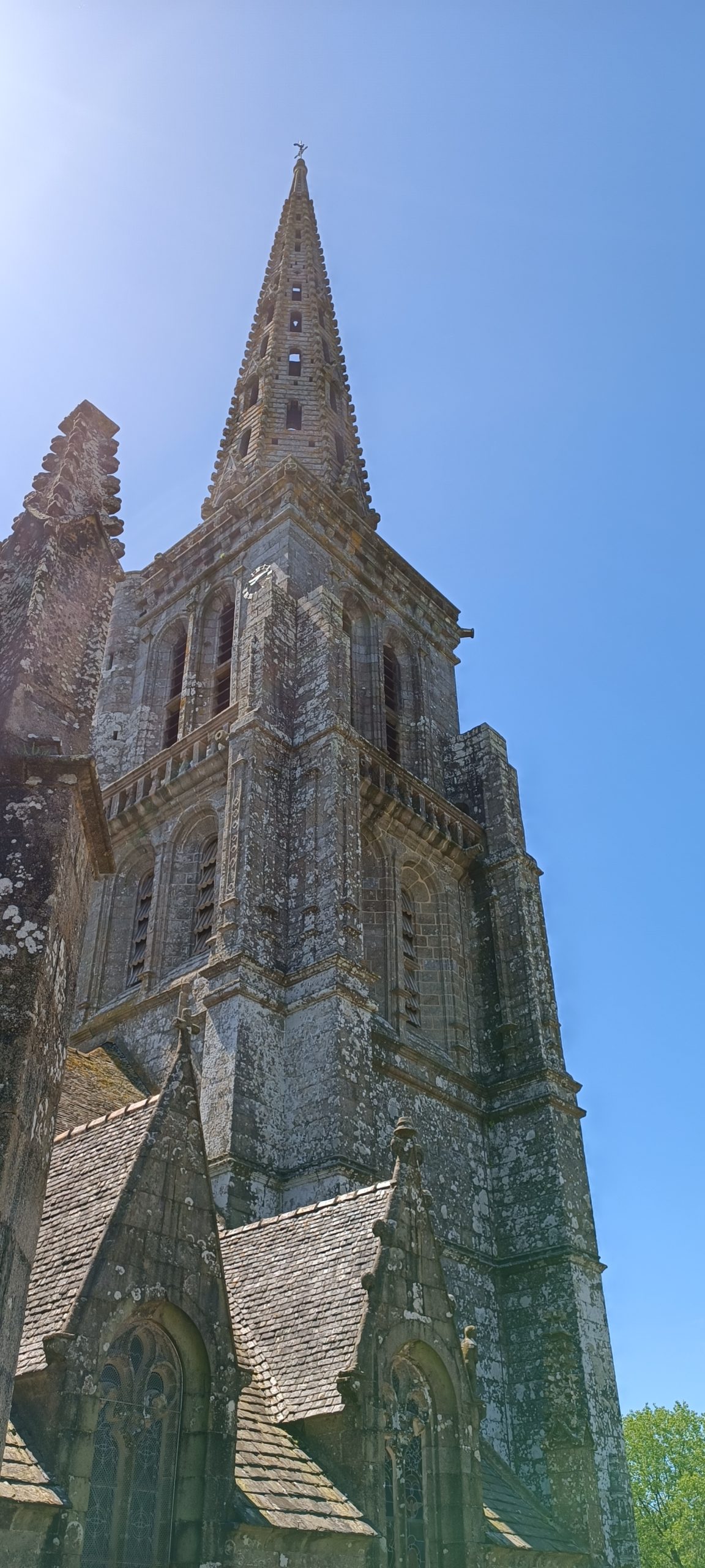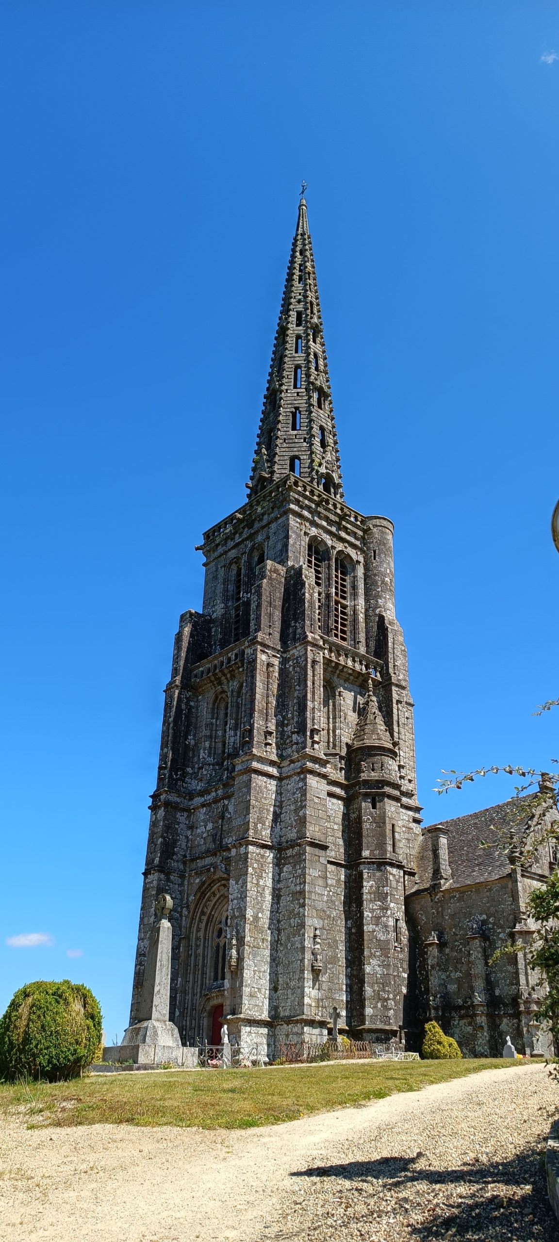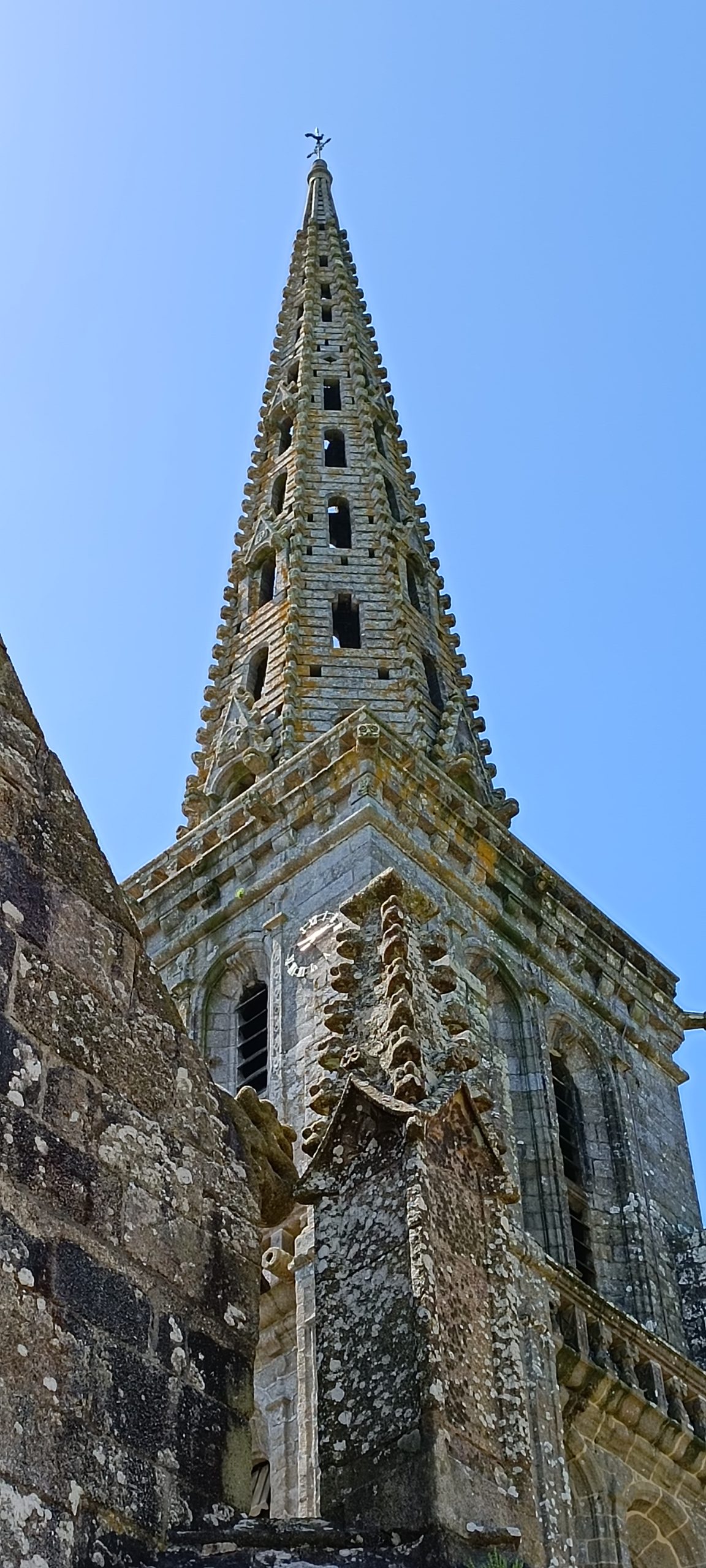 La flèche est haute de 66m. Autant elle rivalise avec cette de St Pol de Léon autant elle a servi en copie à l’église de Bourbriac à 15 km de là.
