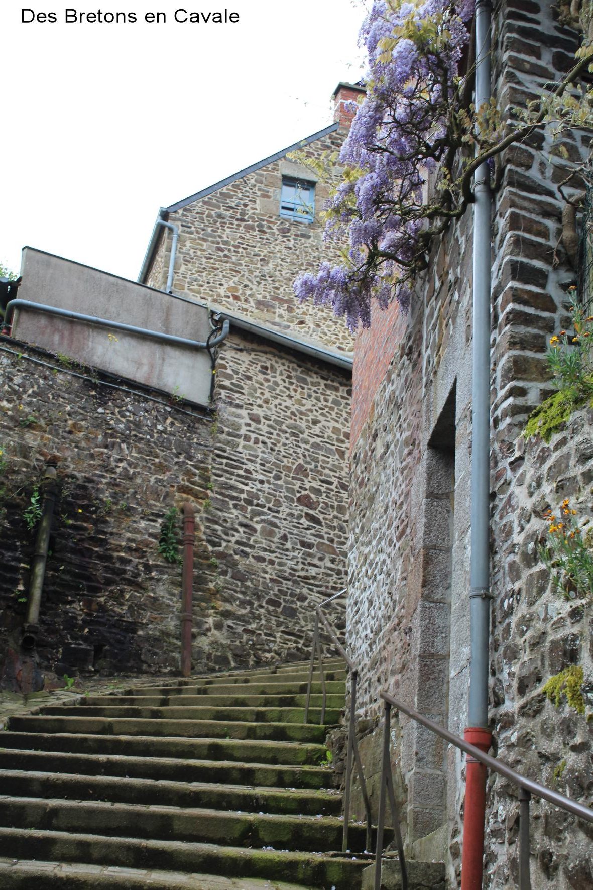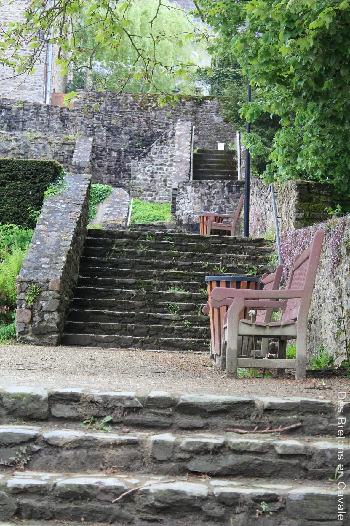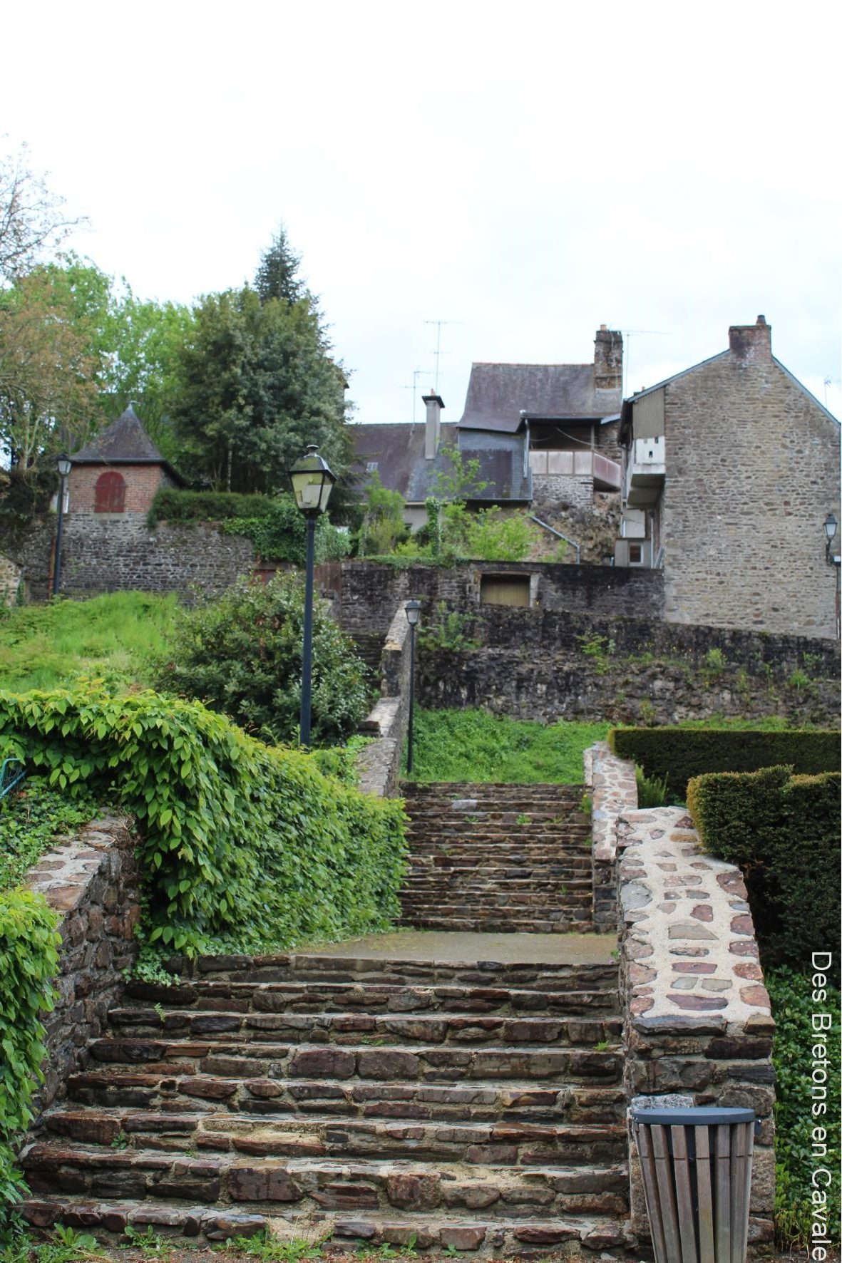 De là nous sommes passés par le Jardin du Val Nançon. Nous sommes tombés à l’entrée du Château. Finalement nous avons suivit le circuit touristique de la ville…. et c’est le même qui est cité dans le Guide Vert ! Ouf ^^. Et nous voilà parti arpenter la ville et c’est bien le mot car pour accéder au Jardin Public avec l’église St Léonard et avoir une superbe belle vue sur le château, ça grimpe dur !!! Cette vue se mérite si vous venez du bas de la ville!