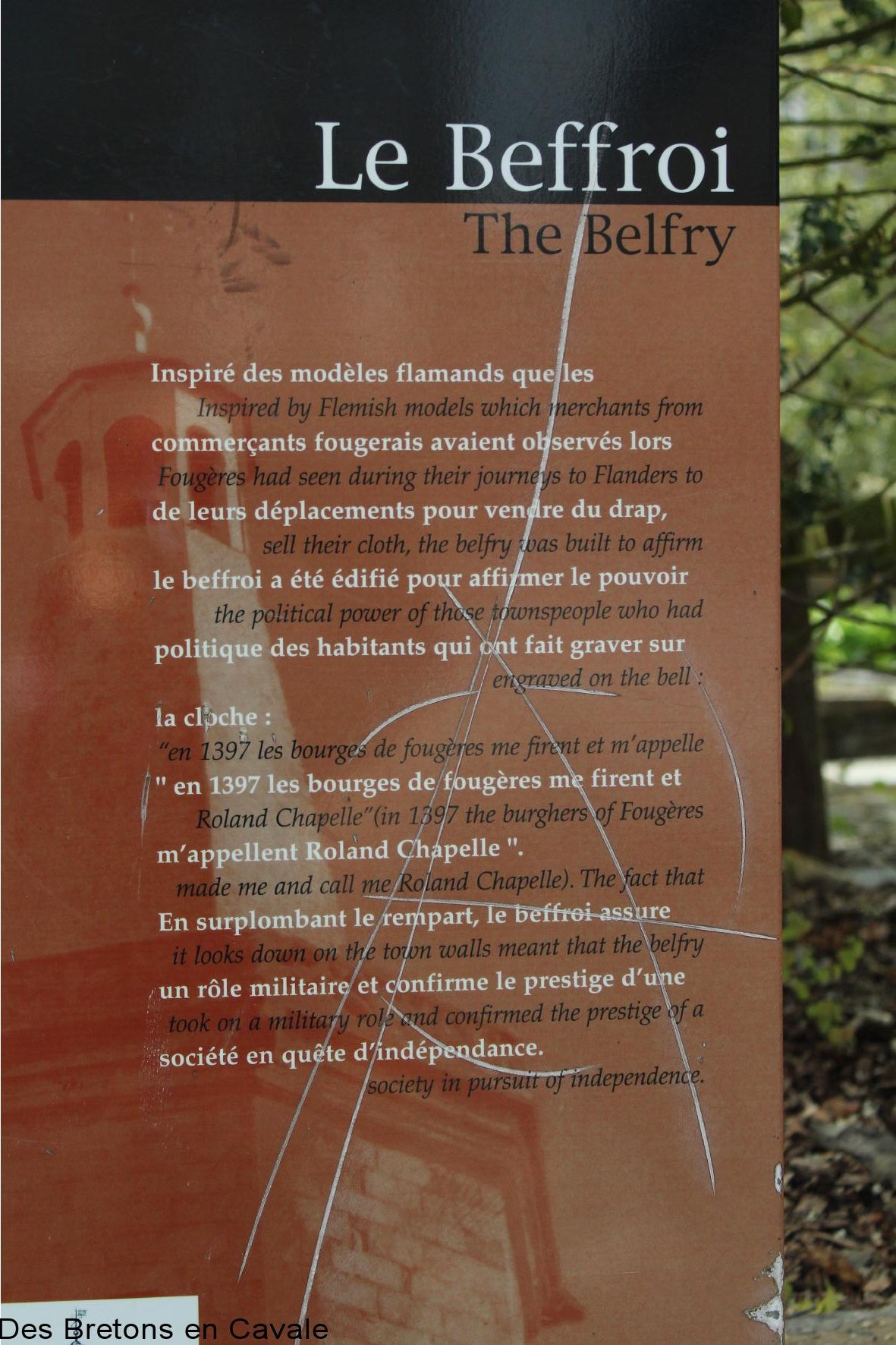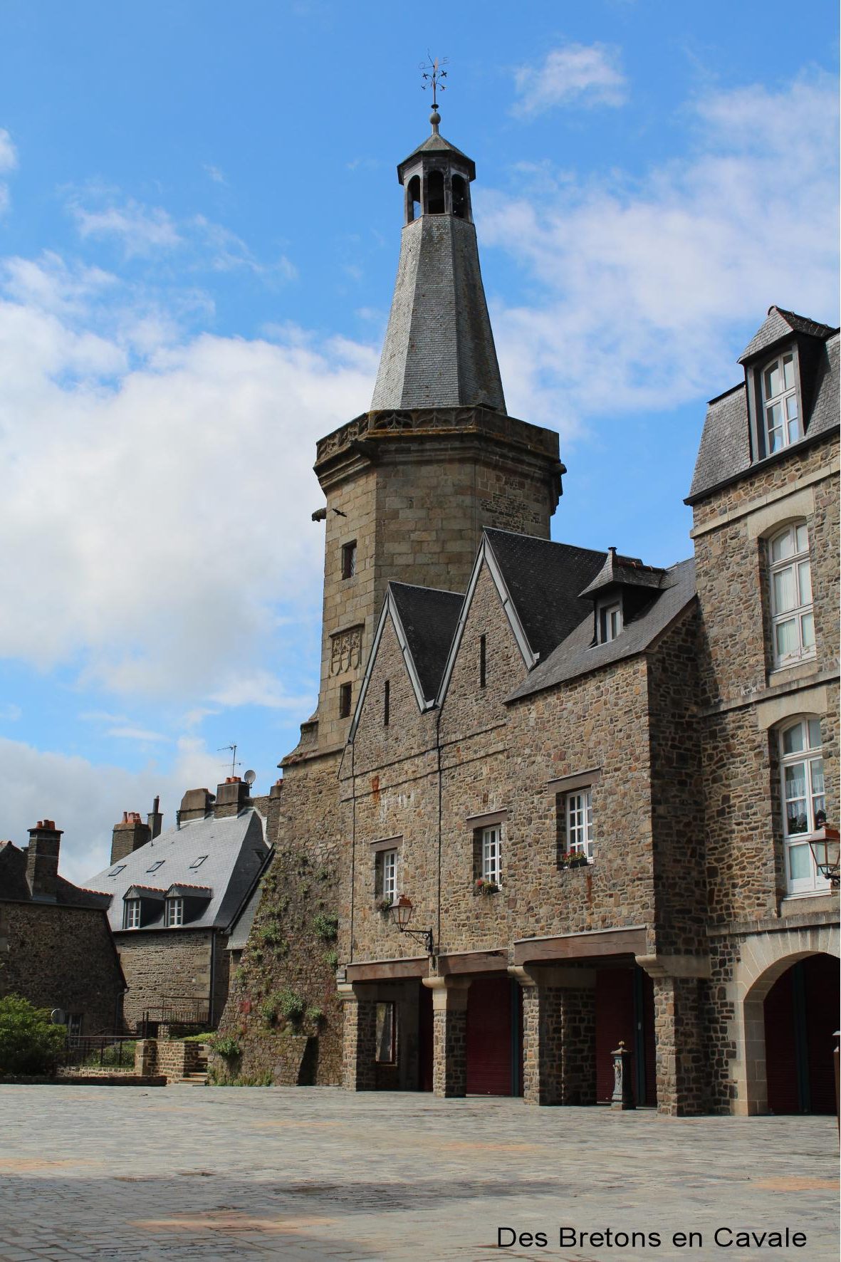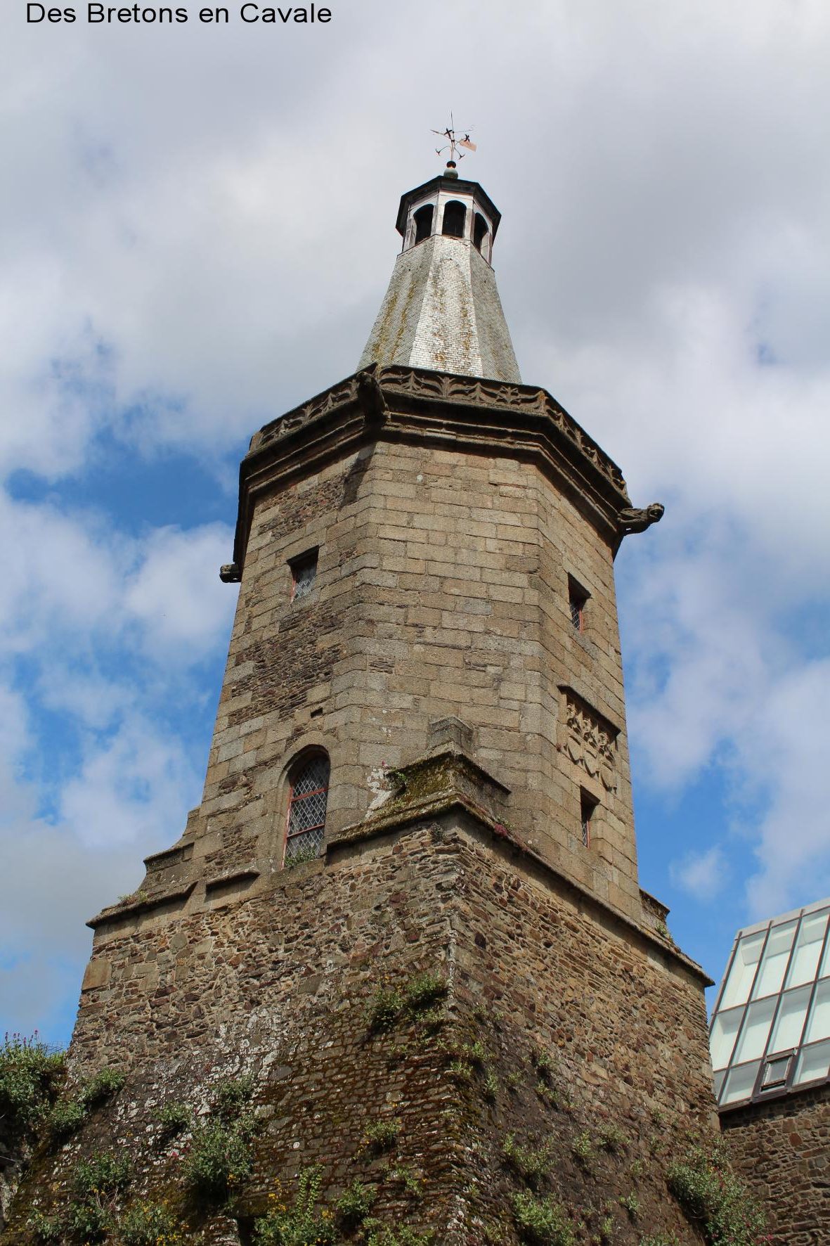 Le beffroi a été construit en 1397, c’est le plus vieux de Bretagne et surplombe la forteresse. Inspirés des modèles flamands, ce sont les drapiers qui ont ramené cette découverte dans leurs valises lors de leurs voyages commerciaux en Flandres. Il n’a pas de cadran. Si la course vers les sommets à été gagné par l’église puisque le clocher de l’église St Léonard dépasse le Beffroi de quelques mètres , les bourgeois auront tout de même réussi à rythmer le temps qui passe autre que par les fêtes religieuses et les offices des prêtres et ce depuis 600 ans !