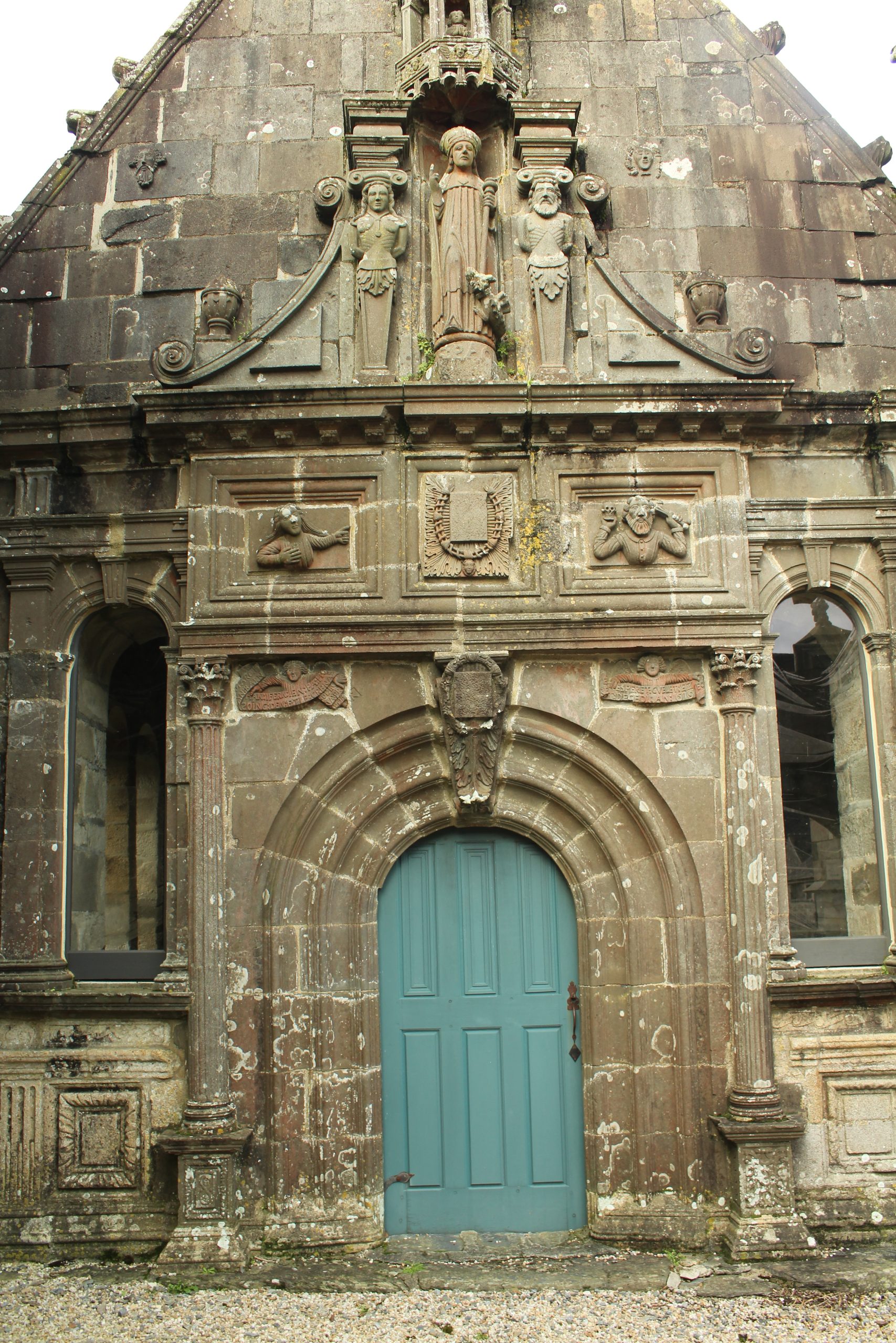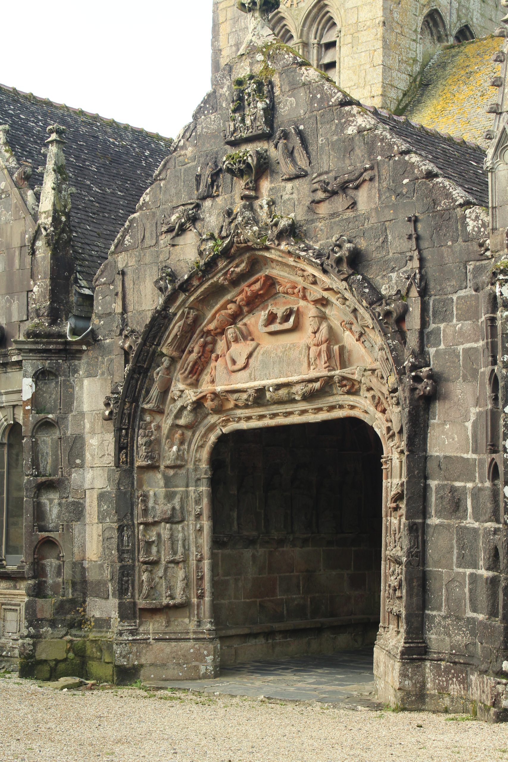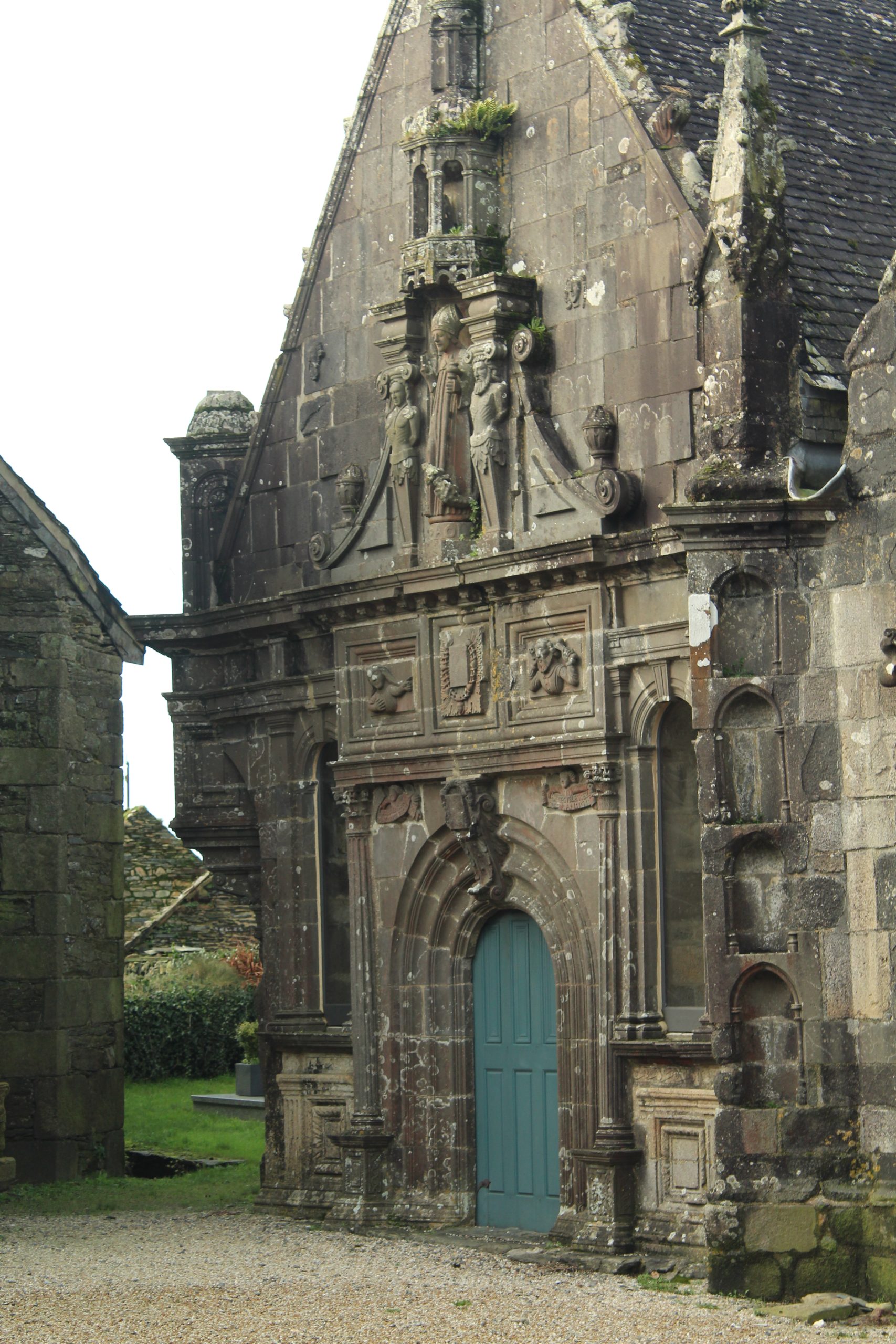 Mais quelle merveille tout de même. Comme chaque enclos paroissial, il faut prendre le temps de tout regarder. Il est particulier aussi avec ces 2 entrées côte à côte. Le porche est bien l’entrée de l’église où se trouvent les niches avec les apôtres. L’entrée à gauche, c’est l’ossuaire. Il porte la date de 1619. On peut prendre un peu de hauteur en montant sur le chemin de ronde. C’est là que l’on surveillait lorsqu’il y avait les foires.