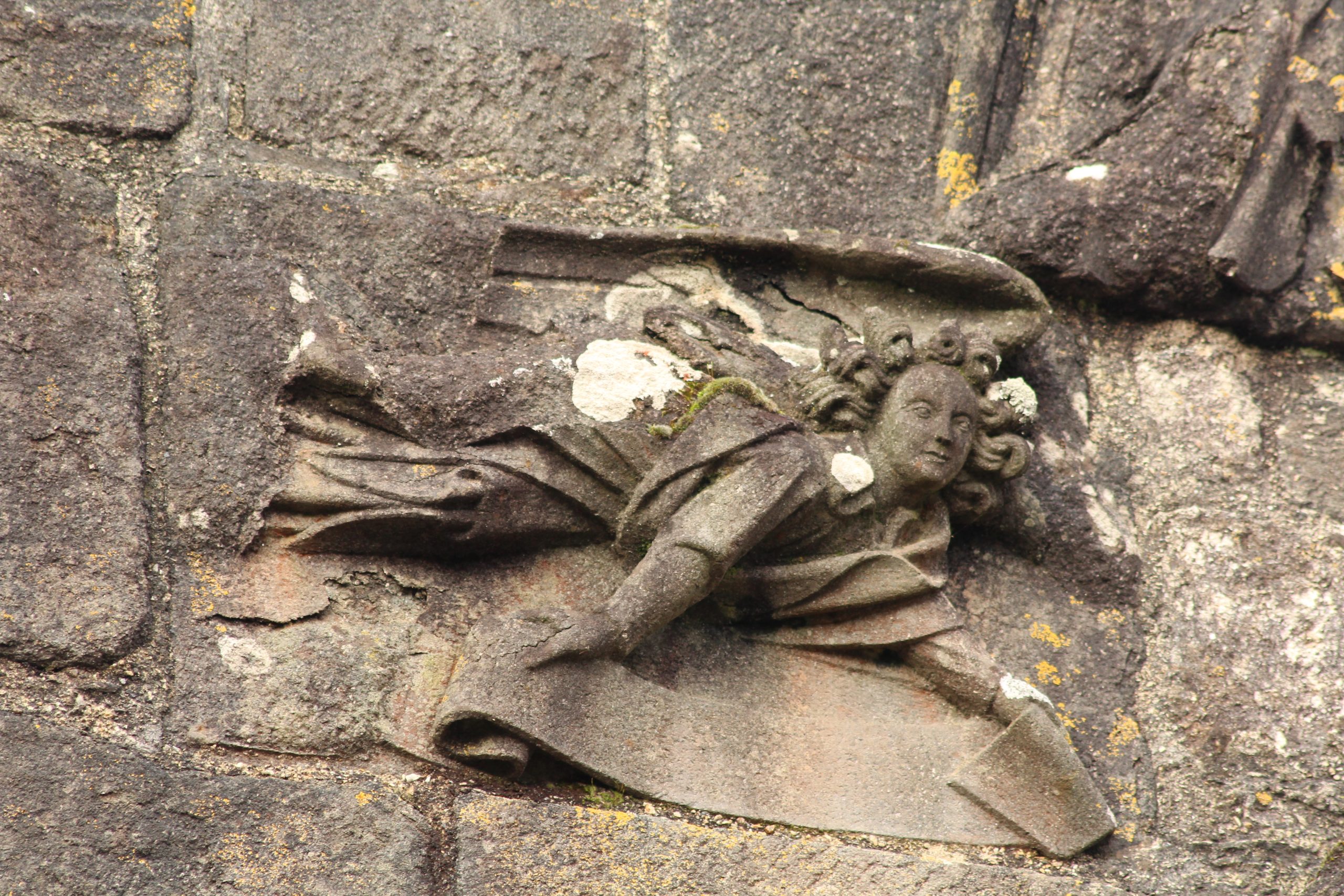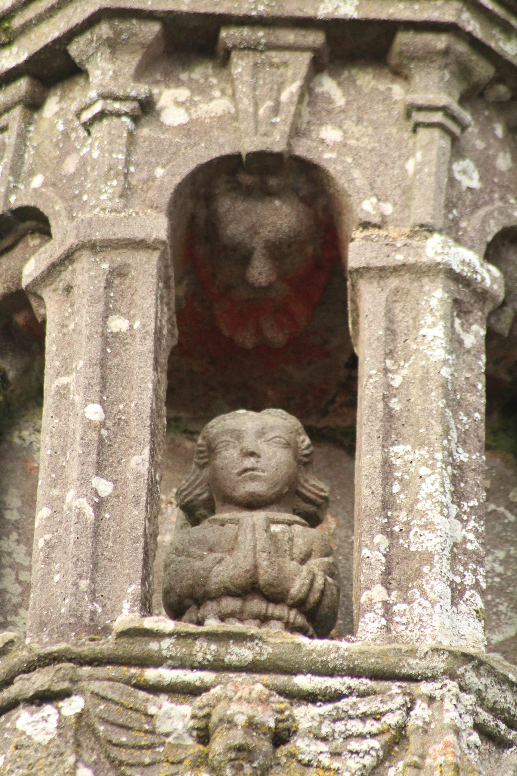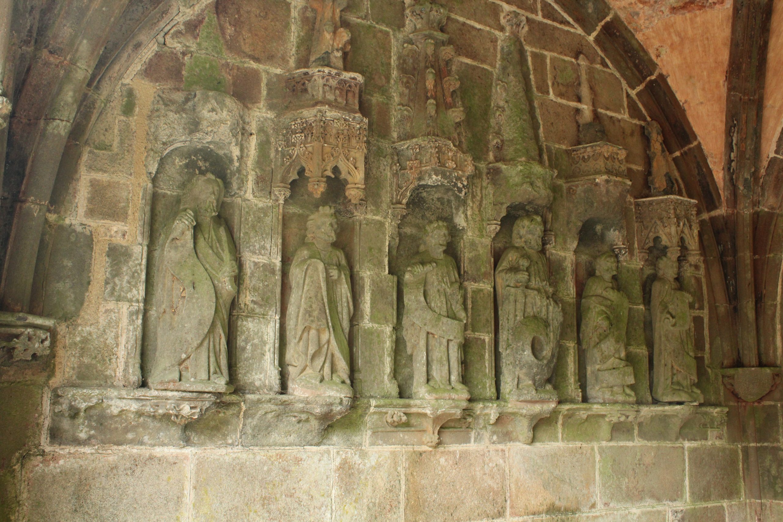 Mais quelle merveille tout de même. Comme chaque enclos paroissial, il faut prendre le temps de tout regarder. Il est particulier aussi avec ces 2 entrées côte à côte. Le porche est bien l’entrée de l’église où se trouvent les niches avec les apôtres. L’entrée à gauche, c’est l’ossuaire. Il porte la date de 1619. On peut prendre un peu de hauteur en montant sur le chemin de ronde. C’est là que l’on surveillait lorsqu’il y avait les foires.