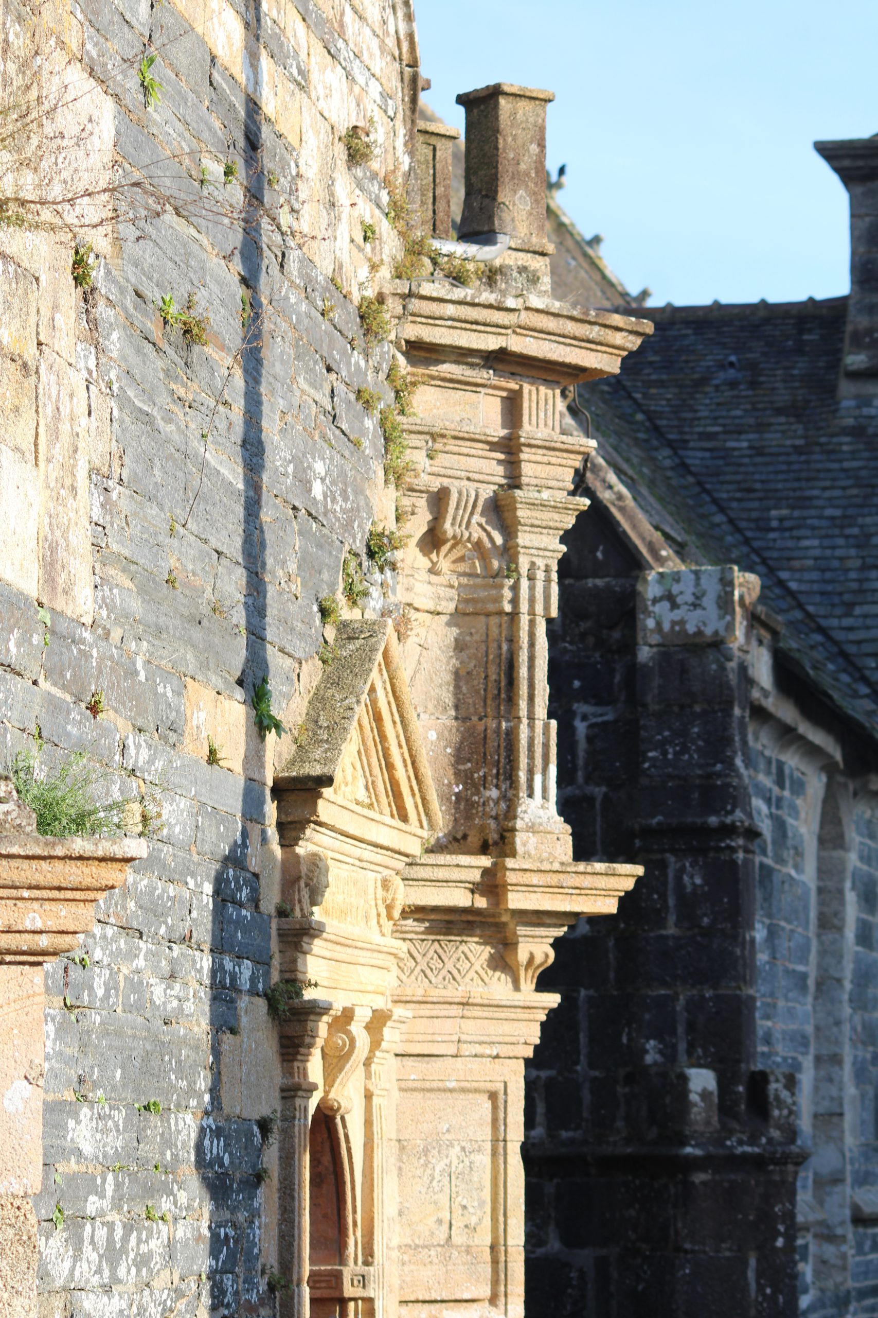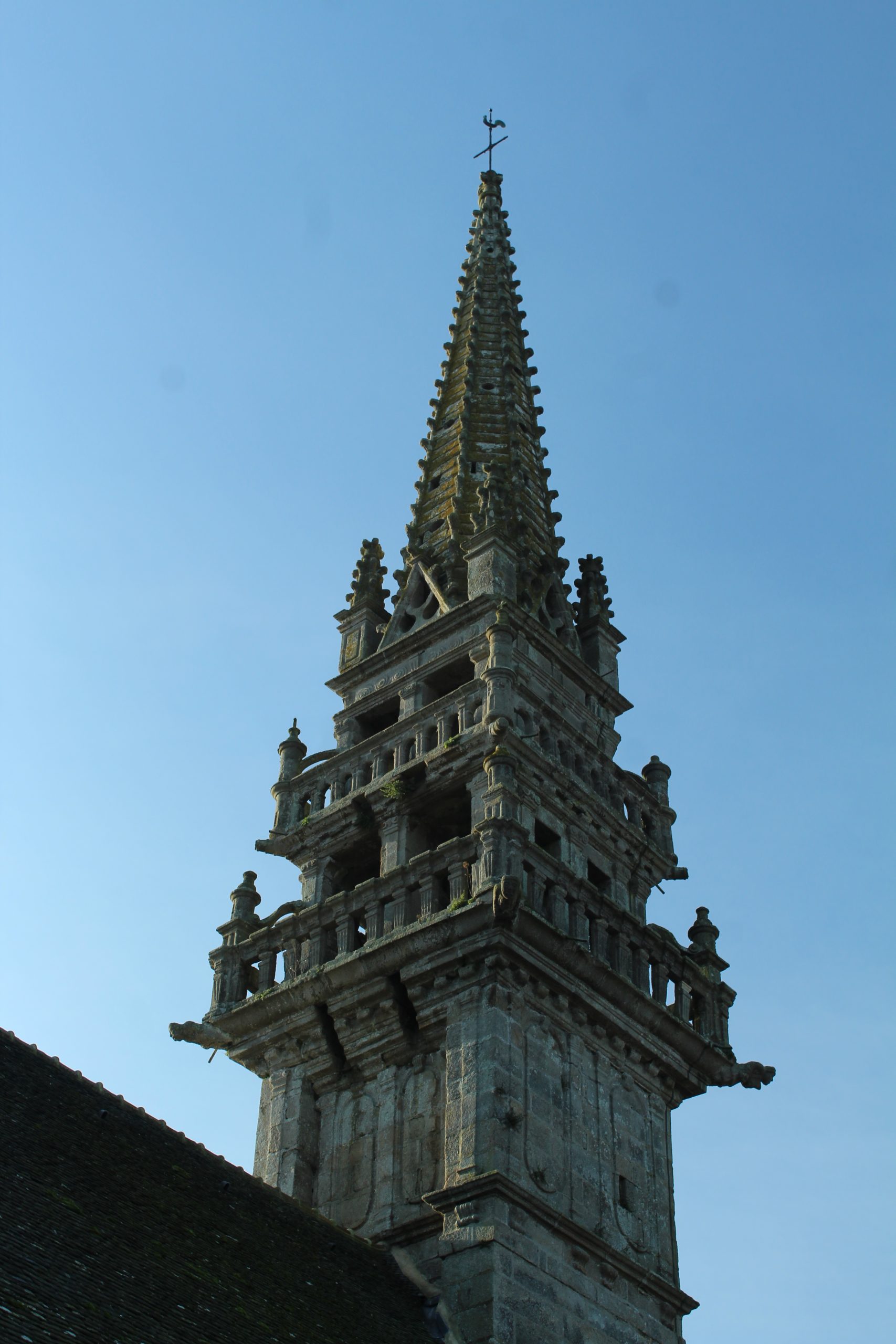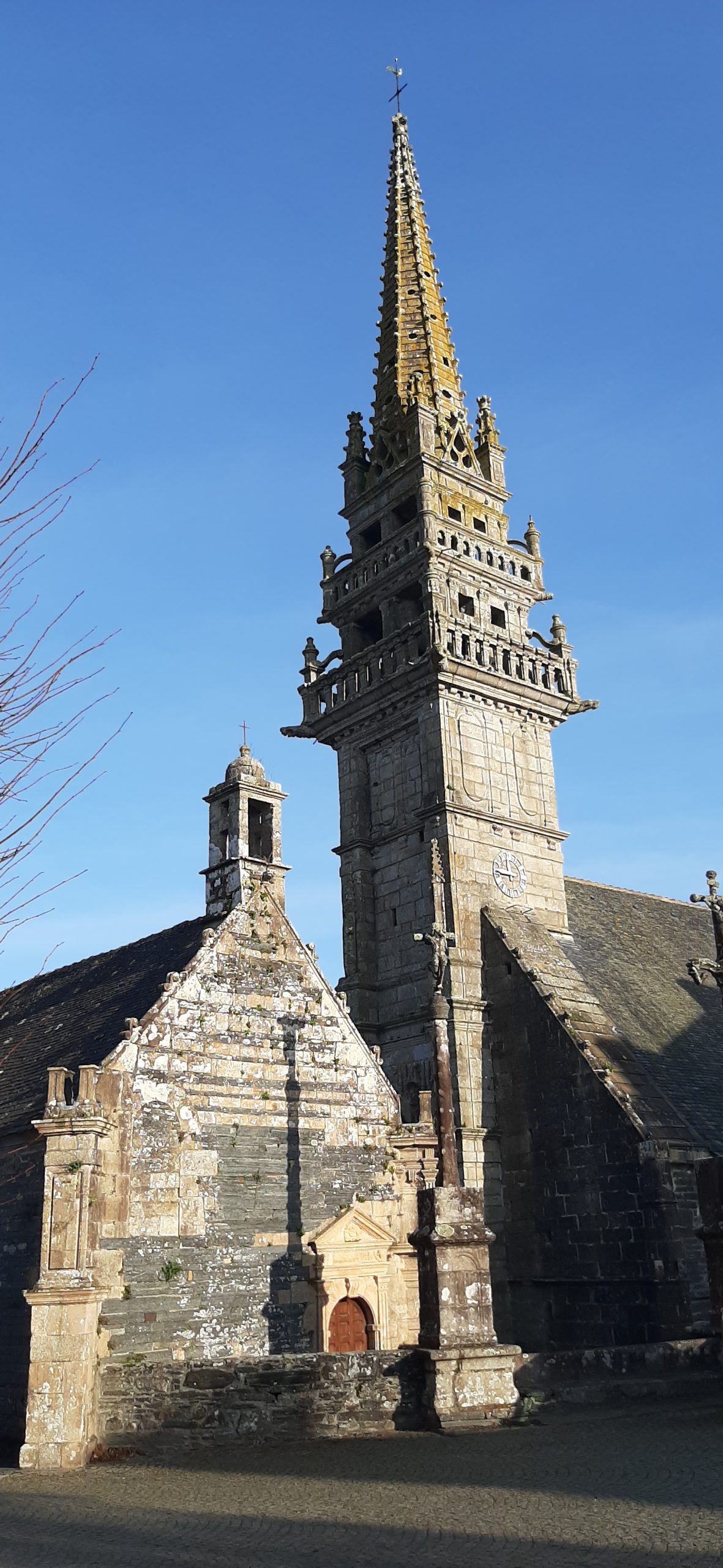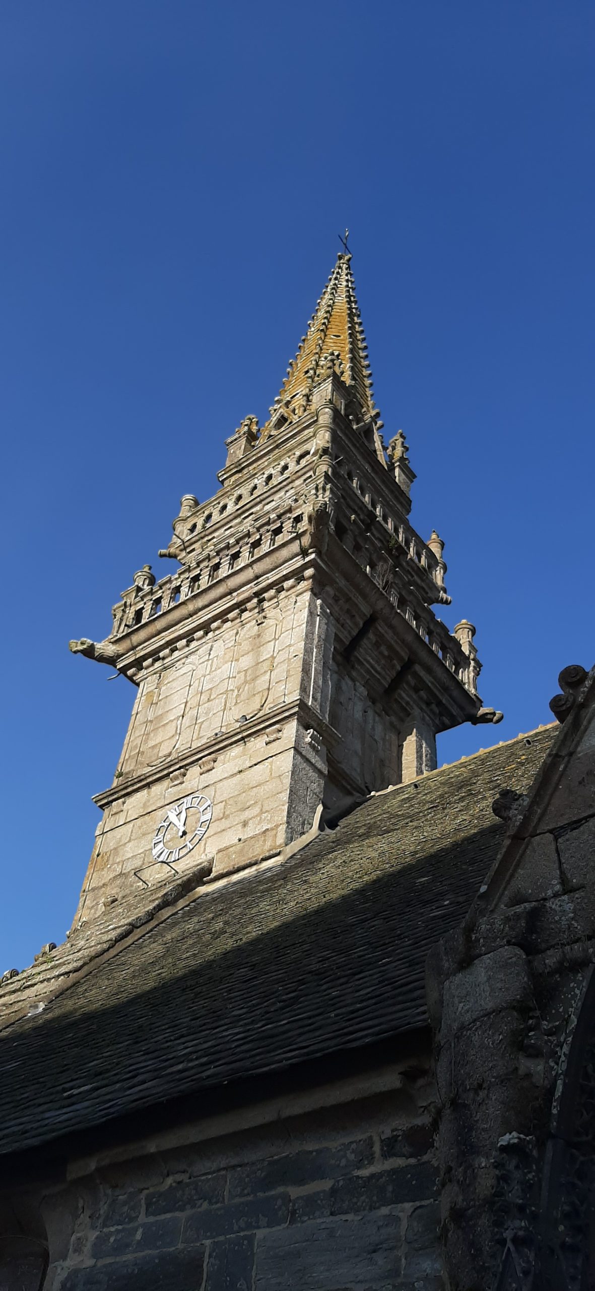 Par contre même s’il manque un imposant calvaire et un arc de triomphe, l’église avec son clocher « Léonard » (1589-90) à double galerie et une double chambre de cloches et sa porte méridionale sont tout simplement magnifiques et riches de décorations. Bon, je vais me répéter une fois de plus mais je reste scotché devant tant de travail pour une époque qui n’avait rien des outils que l’on a aujourd’hui. Les détails sont là malgré les siècles qui passent. Je suis toujours aussi fascinée devant ces pierres ♥
