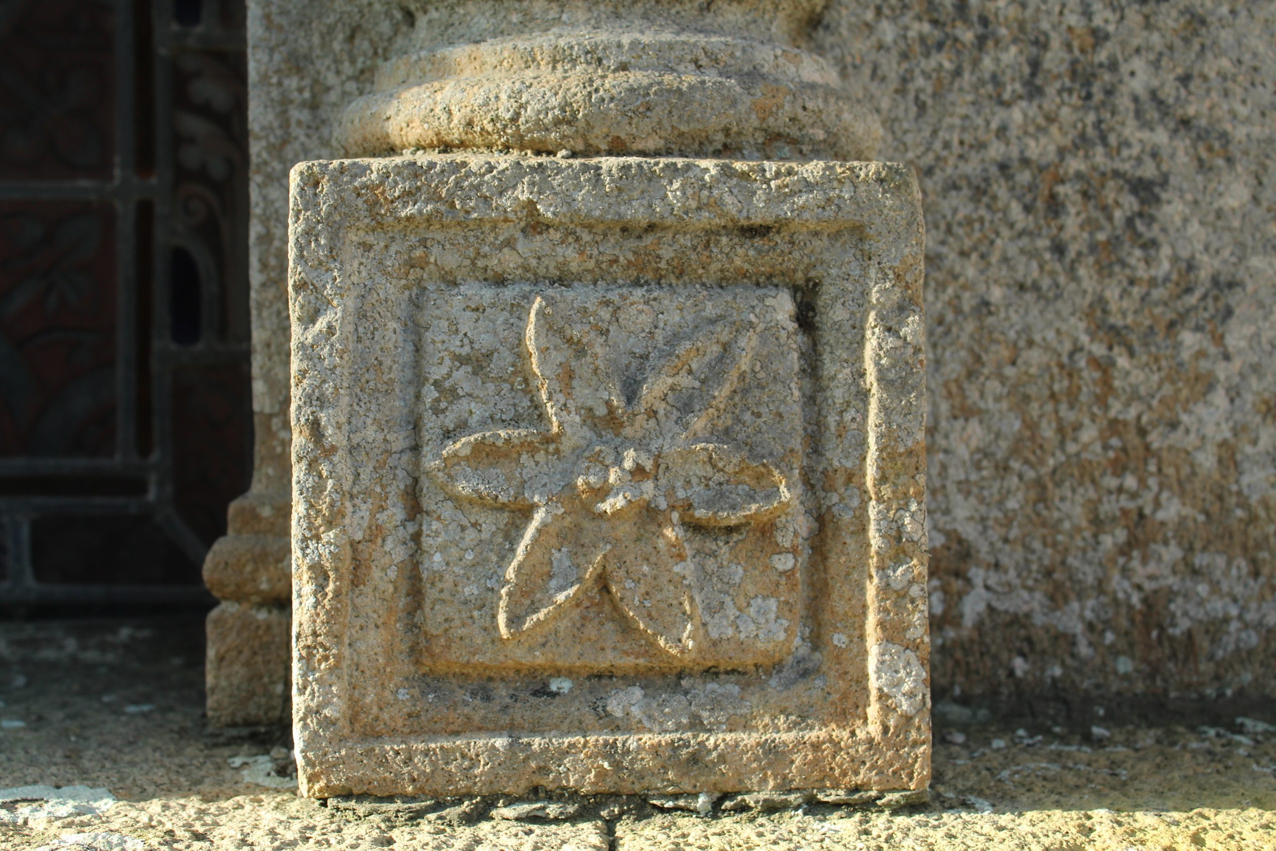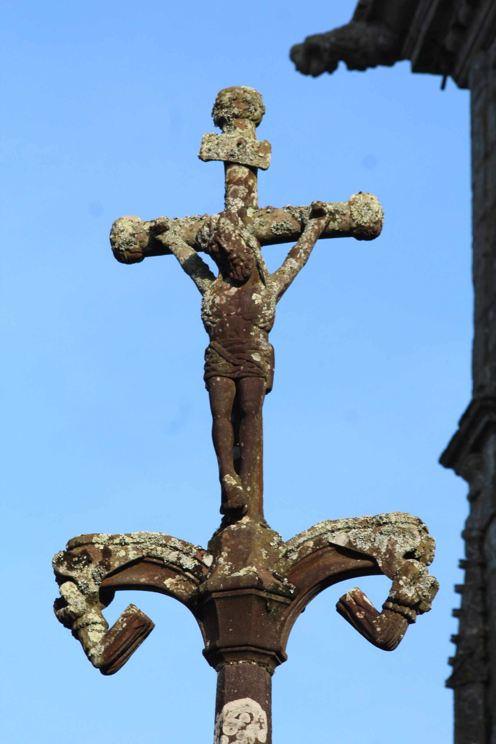 Quand on arrive, on trouve un modeste calvaire et ça marque un peu … oui dans les autres enclos paroissiaux c’est généralement le calvaire que l’on voit en premier tellement il est imposant.