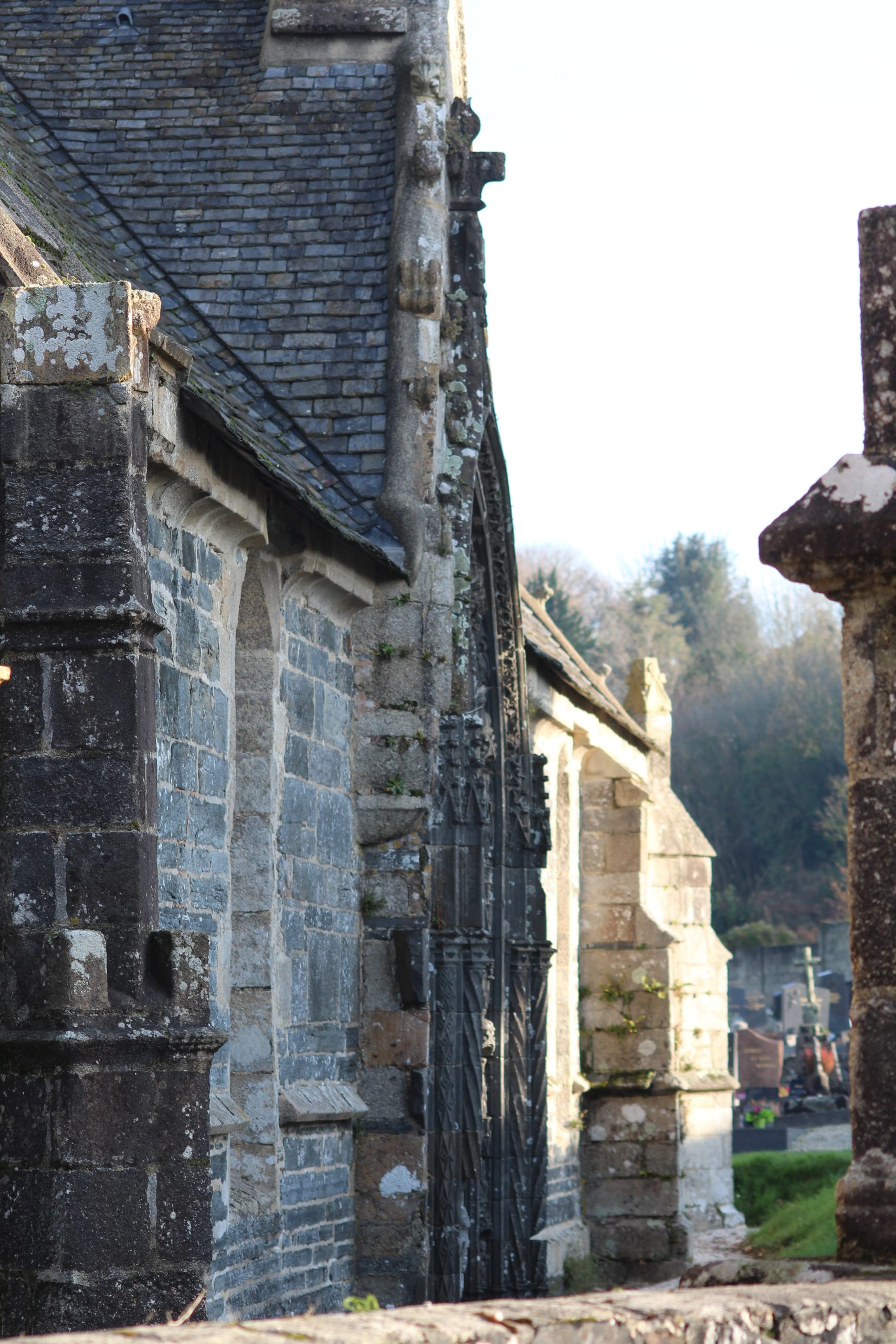 L’enclos n’est pas très grand, la chapelle ossuaire colle l’église et juste derrière le cimetière. Difficile de prendre en photo l’ensemble.