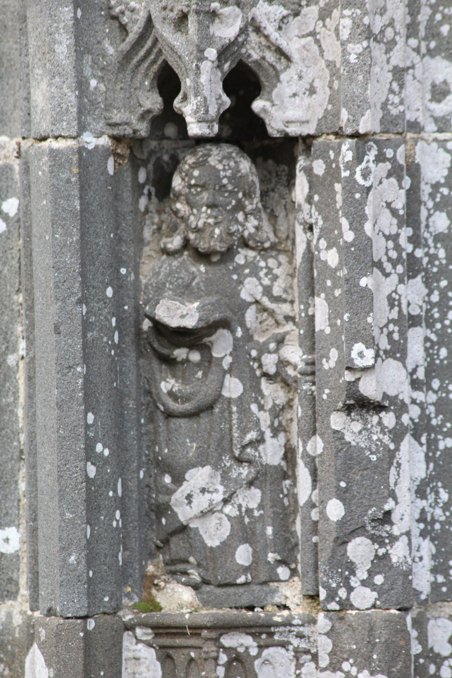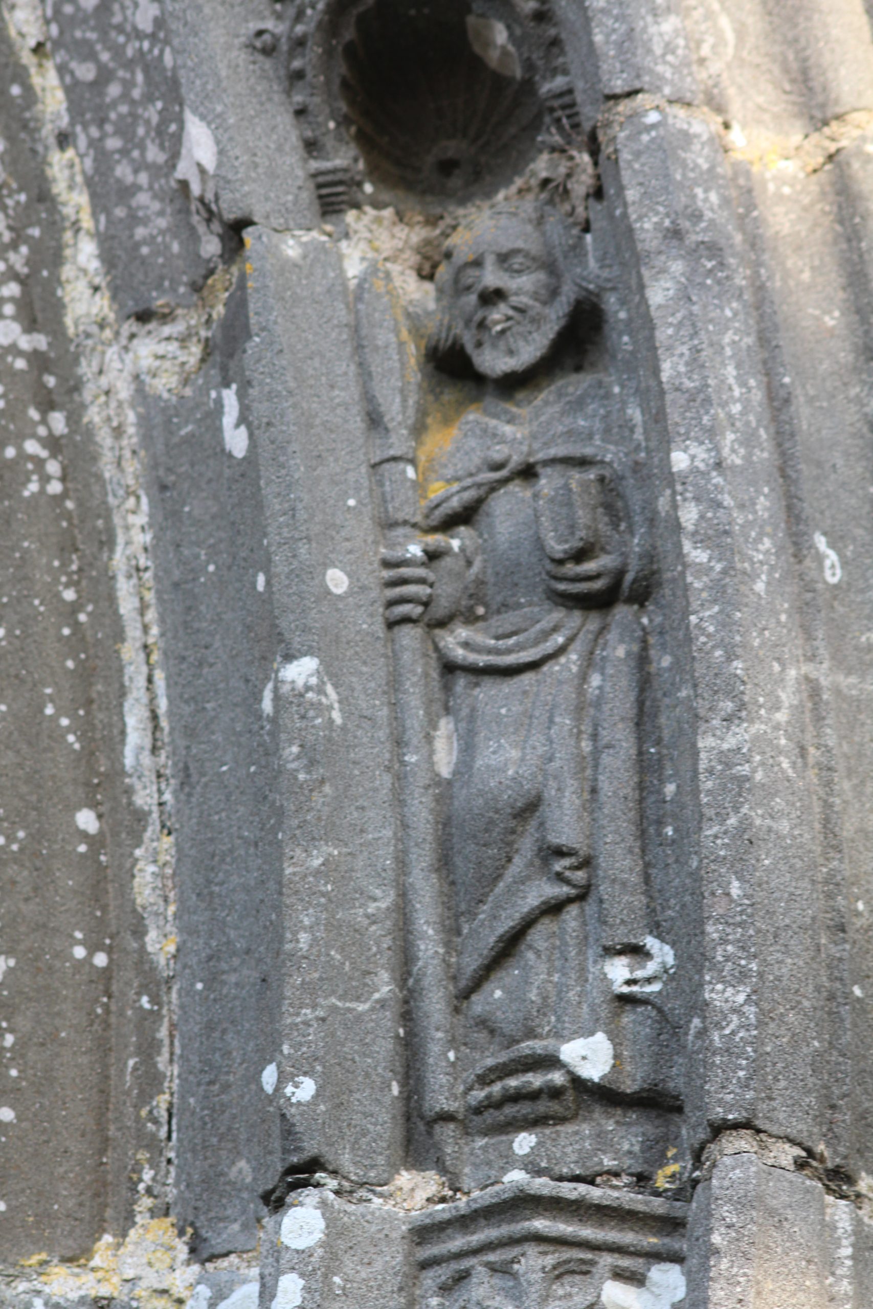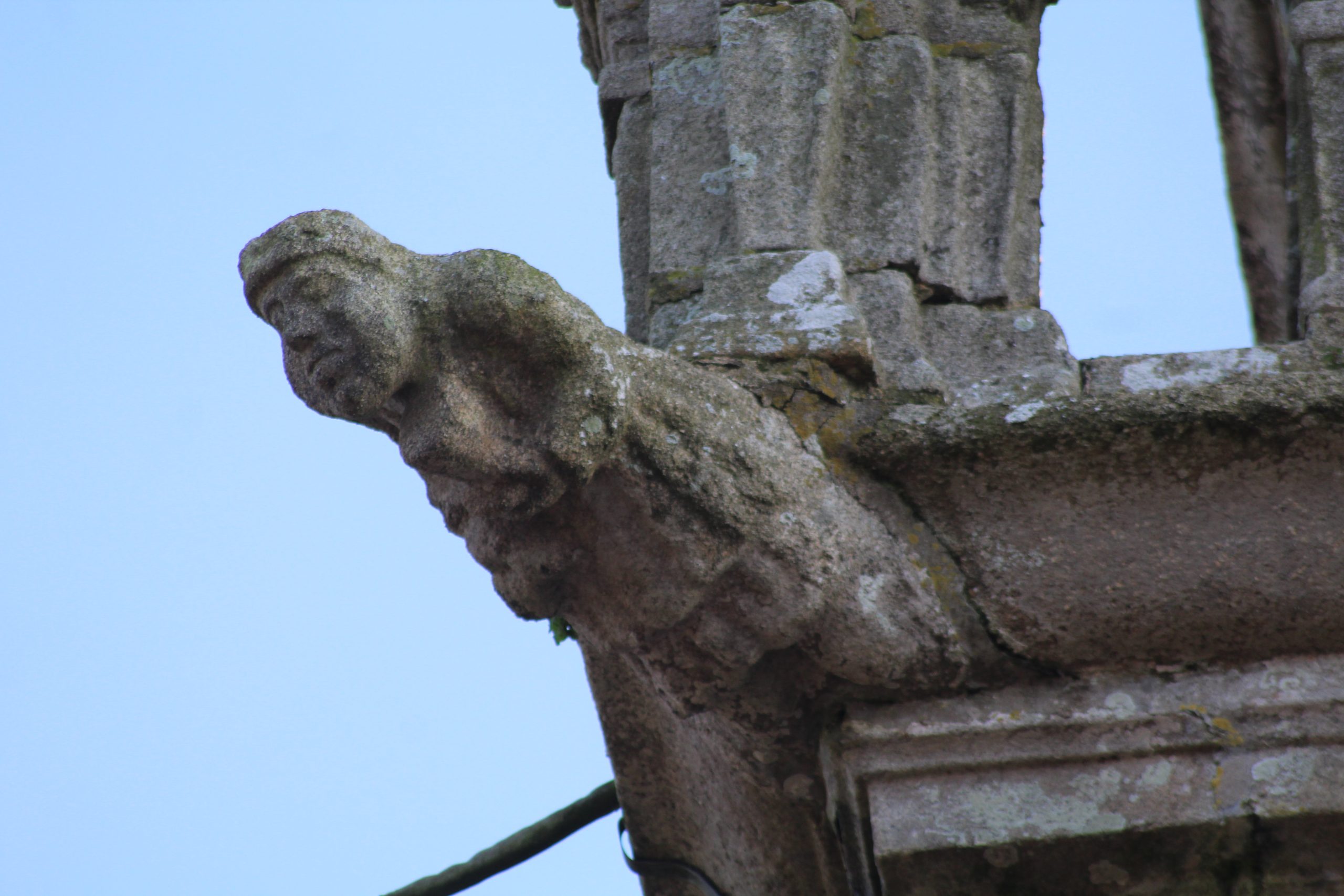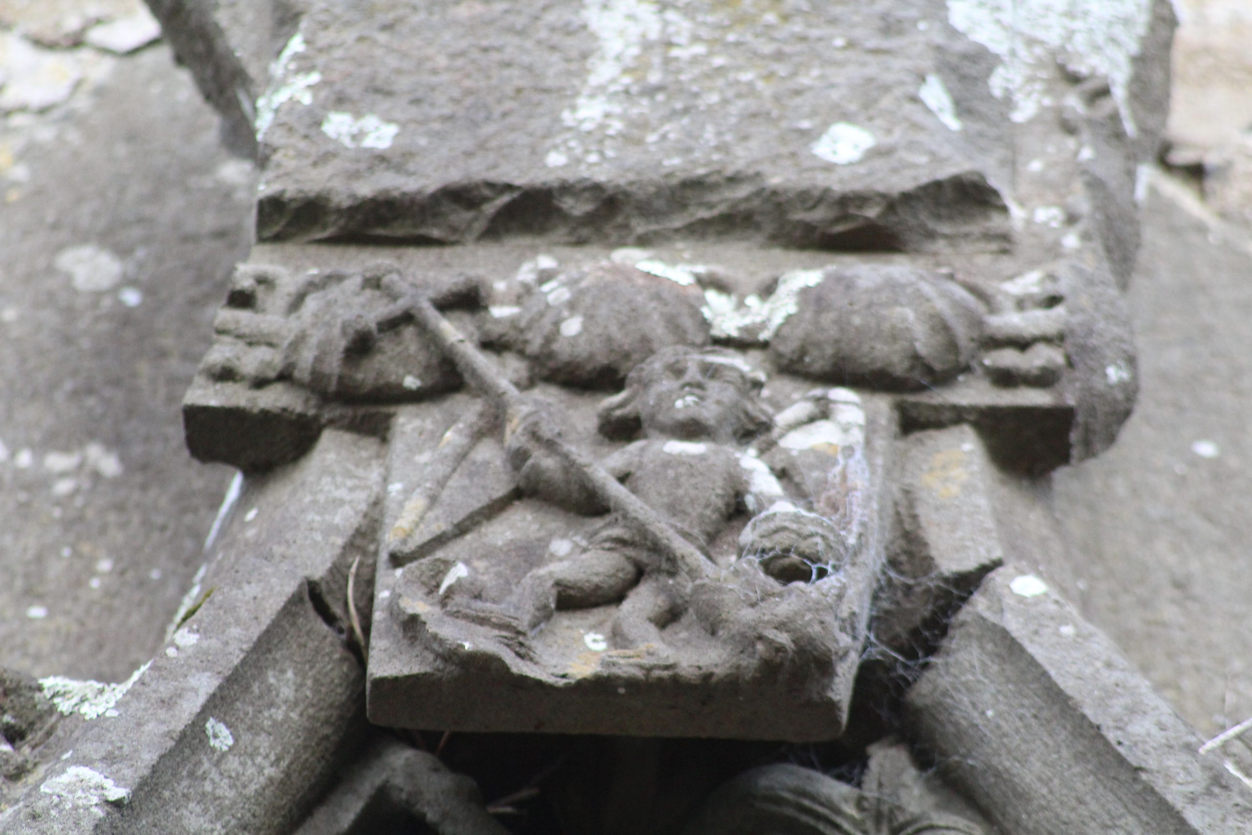 C’est l’Ankou (en breton c’est la personnification de la mort) qui vous accueille non pas avec une faux mais avec un flèche qui est d’ailleurs si l’on regarde bien dirigée vers la frise de personnages en bas de la façade.