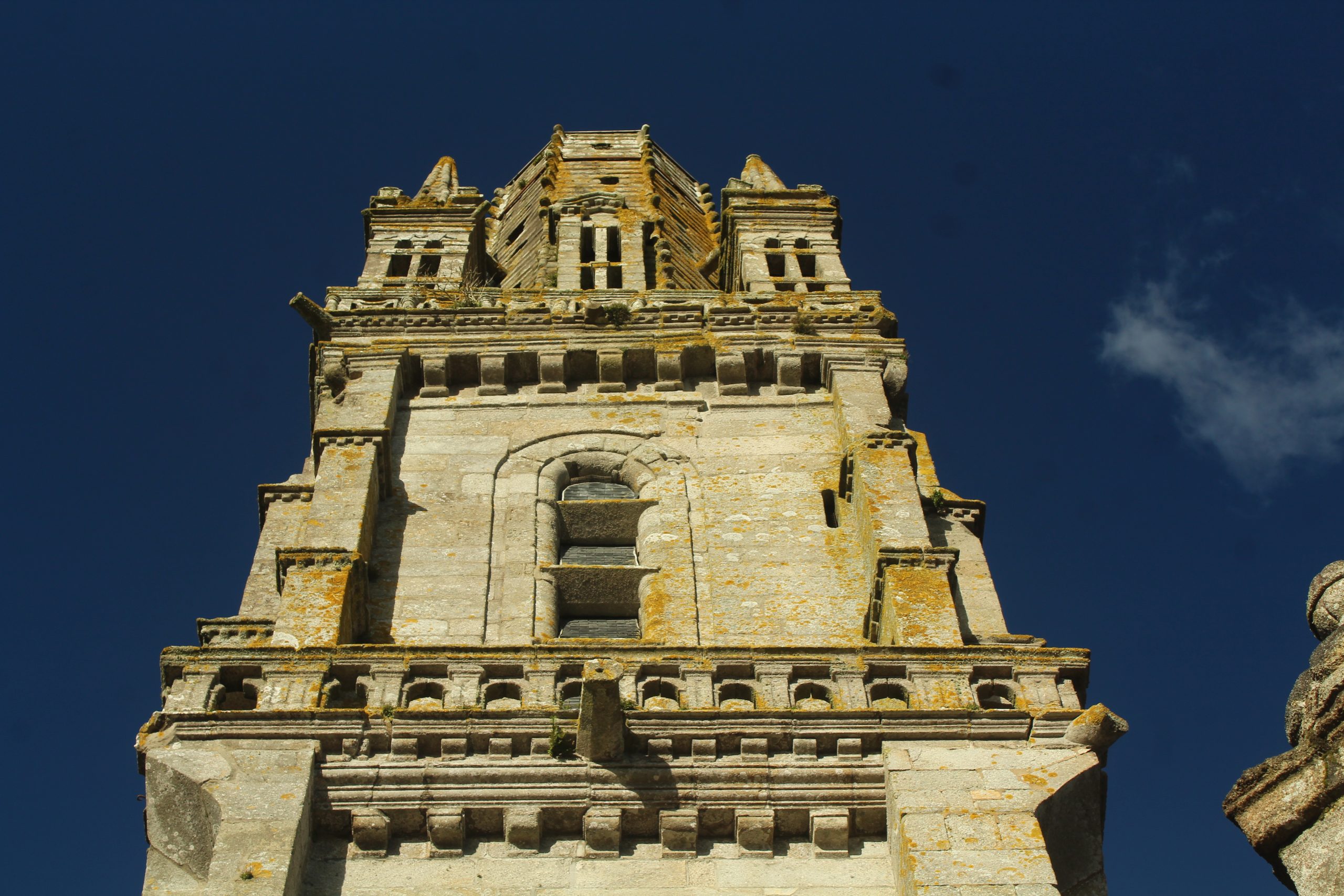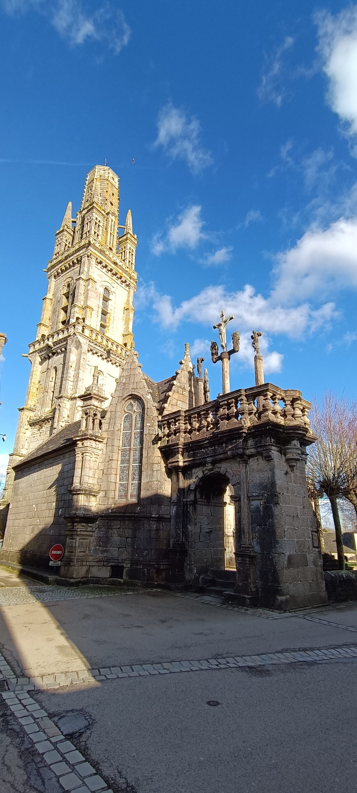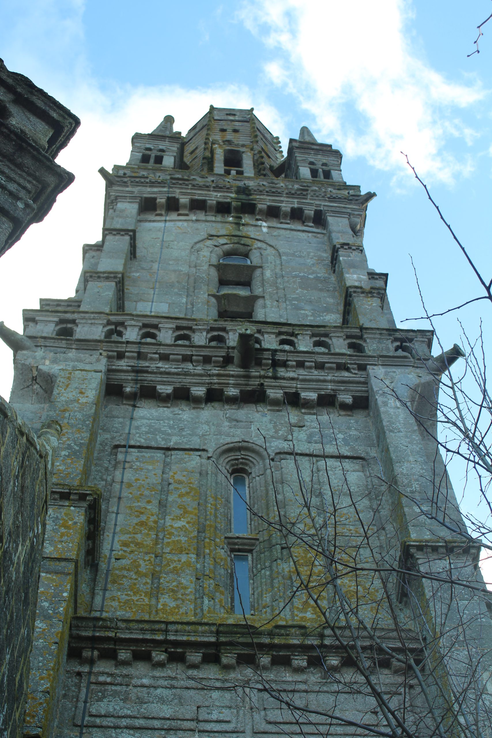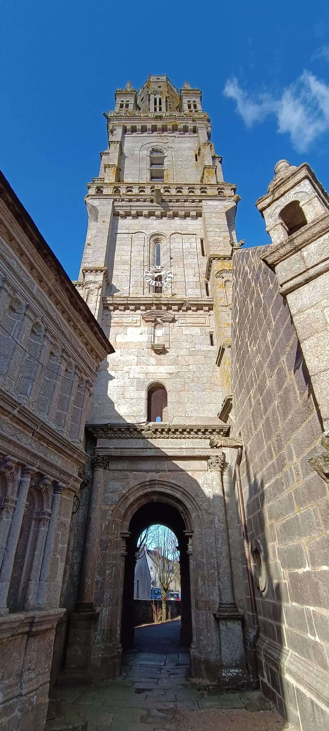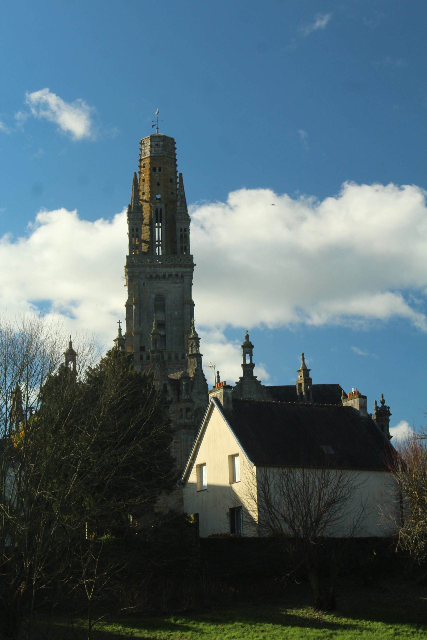 Le clocher date de 1573. A l’origine, il mesurait 75m de haut, presque aussi haut que le Kreisker de St-Pol de Léon qui lui est de 78m. Il fut frappé par la foudre en 1809, ce qui l’amputa de 18m.