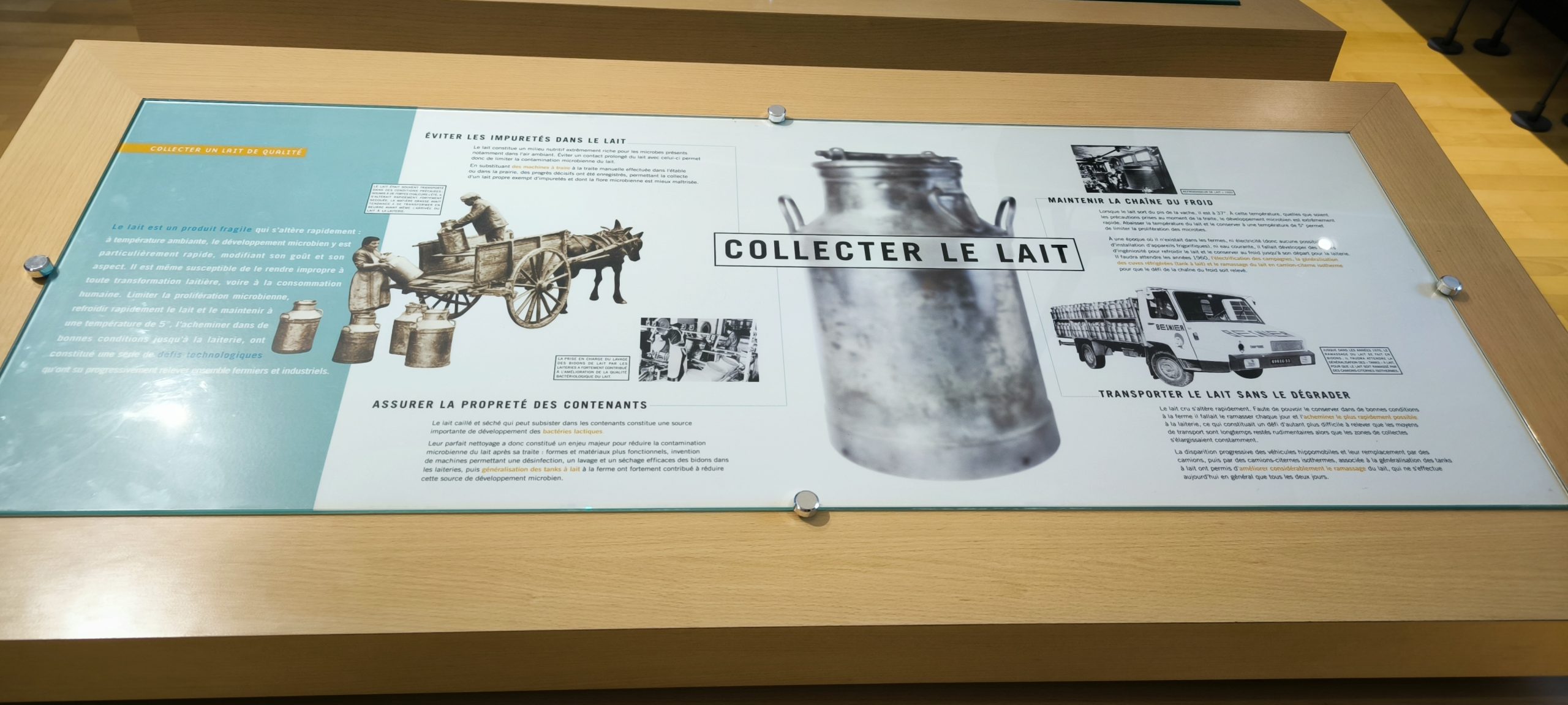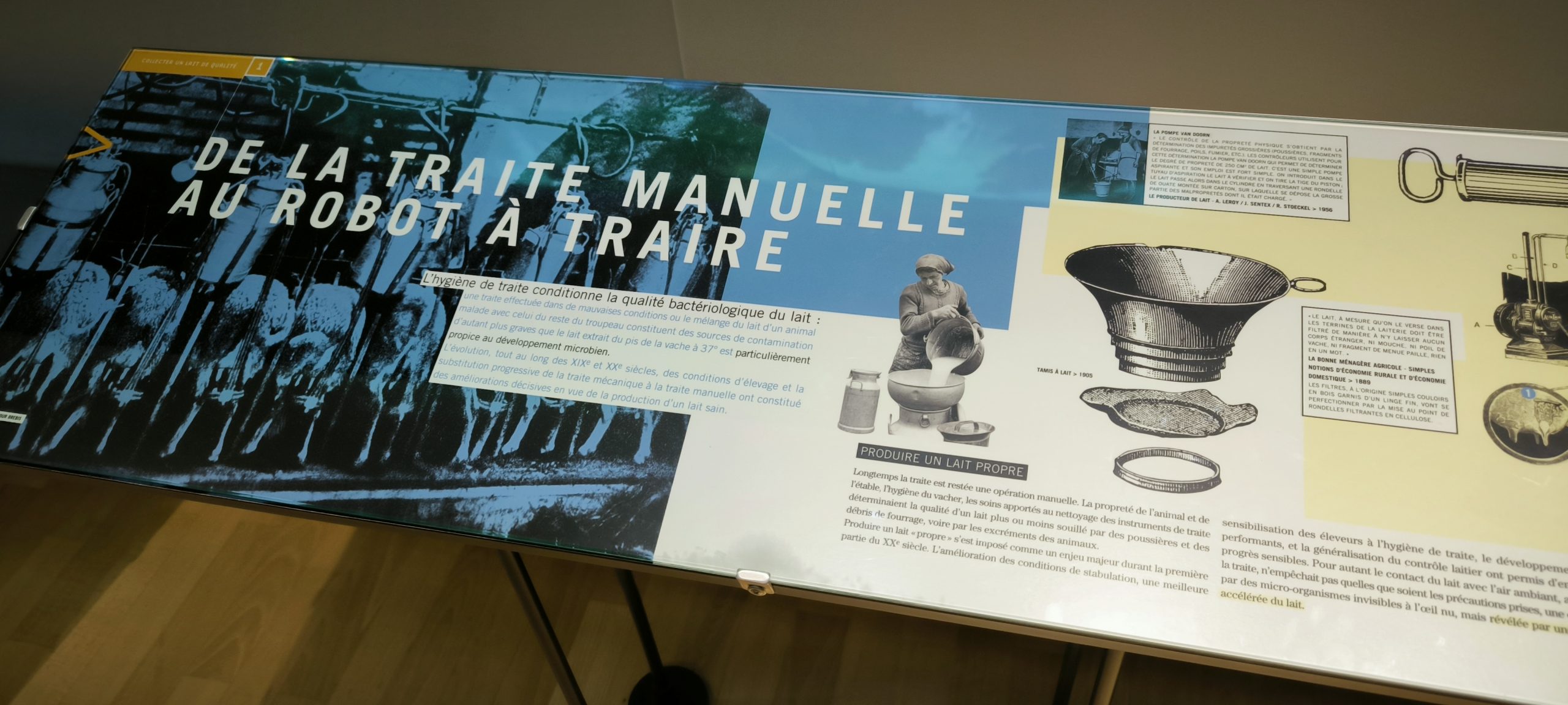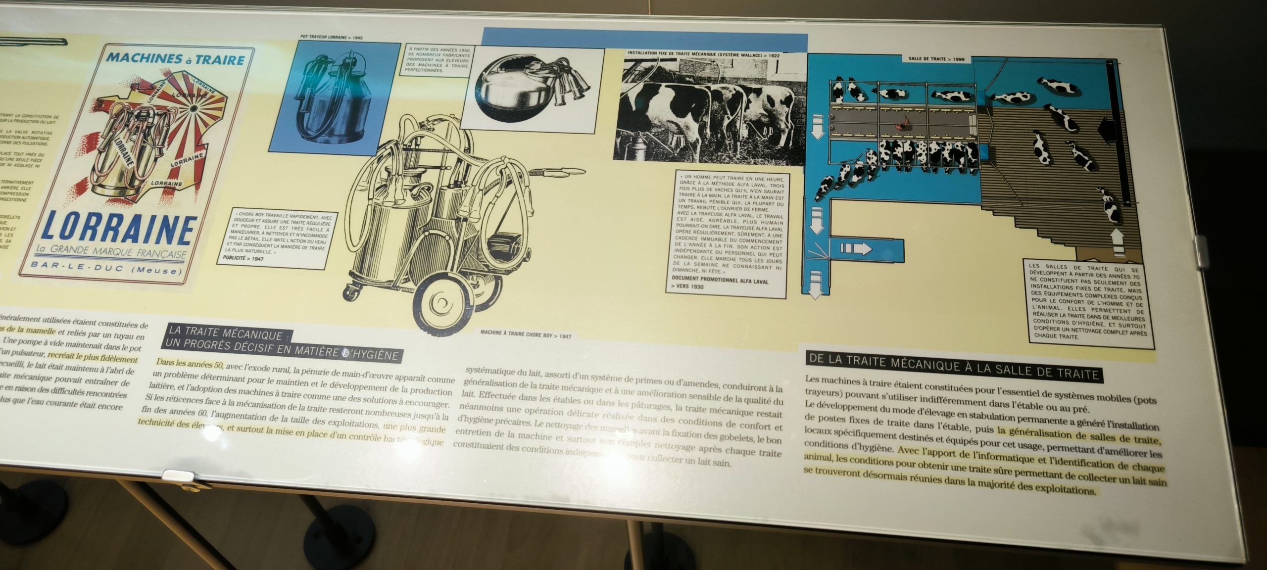 On découvre comment les vaches produisent le lait, la manière dont il est acheminé. Et toutes étapes de transformation du lait en beurre, en crème, en fromage ect… tous les ustensiles utilisés, écrémeuses centrifuges, barattes, bidons, les moules etc… et en bonne bretonne que je suis le beurre 1/2 sel c’est la vie ^^.
