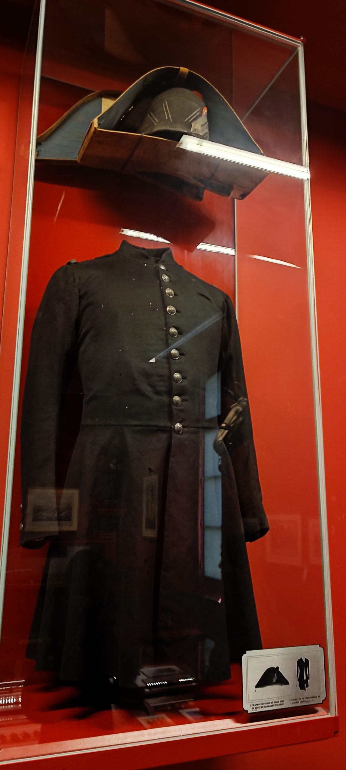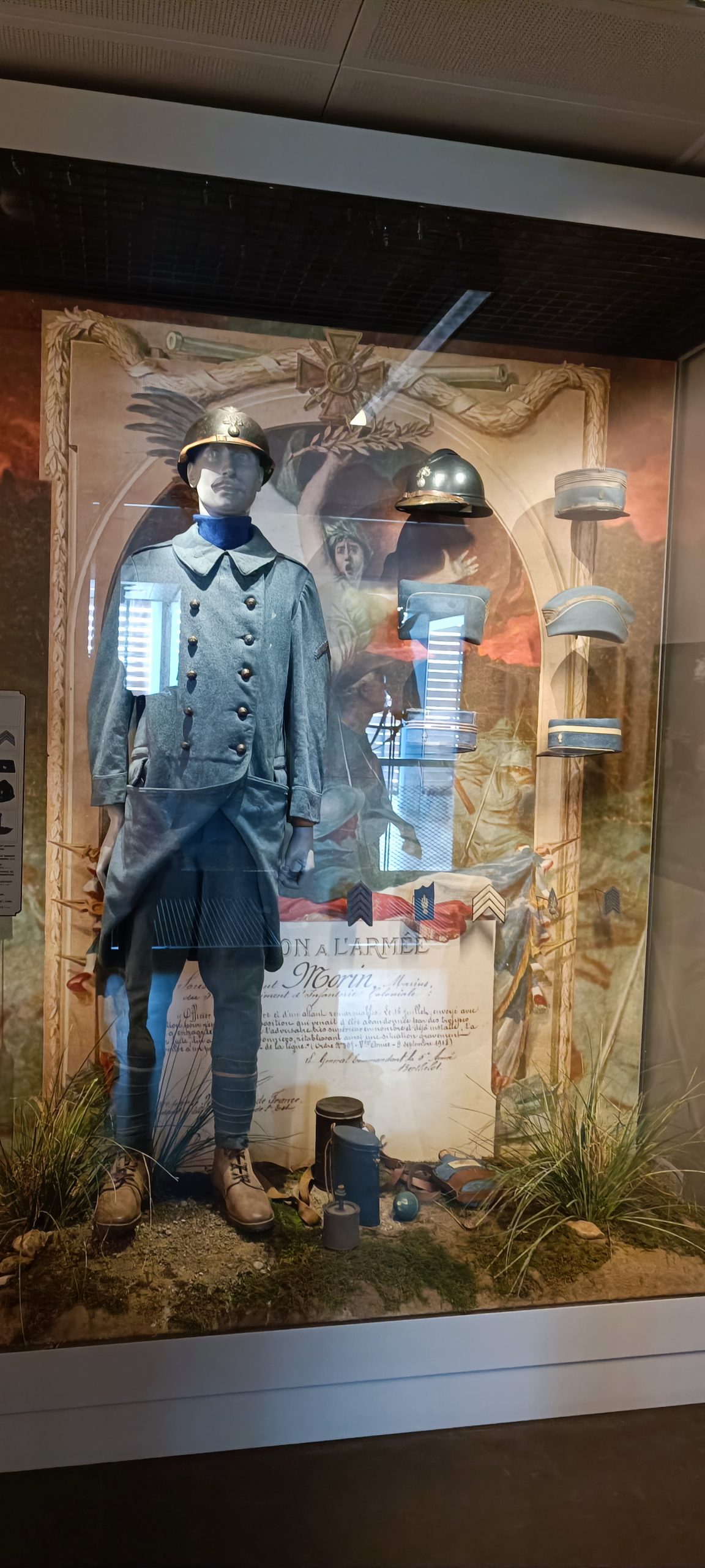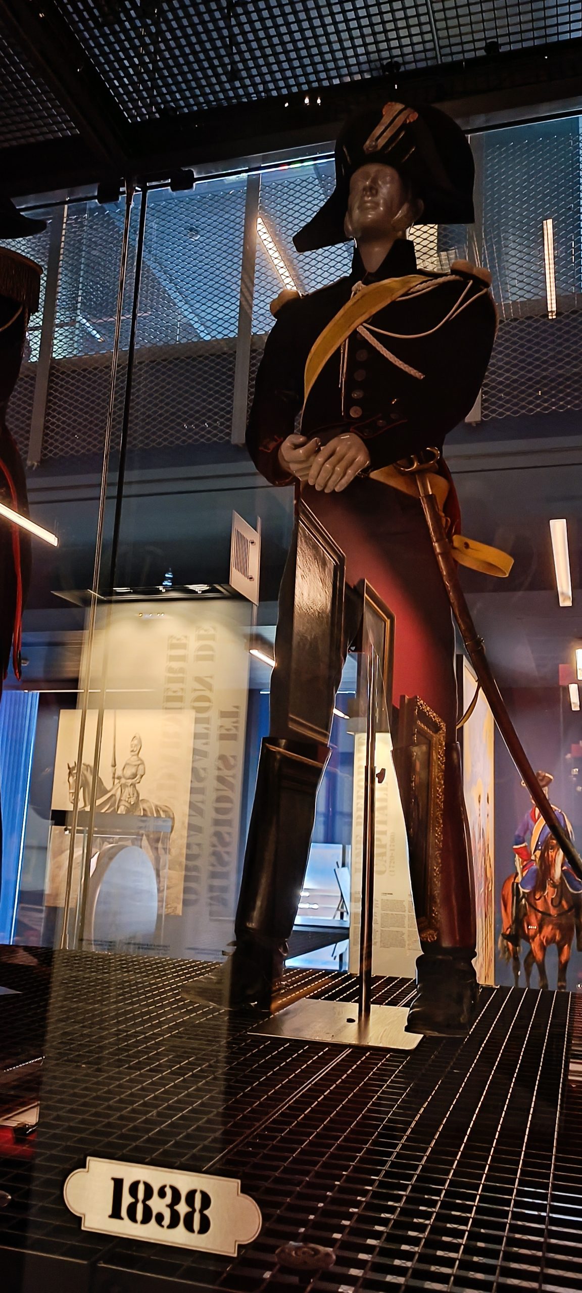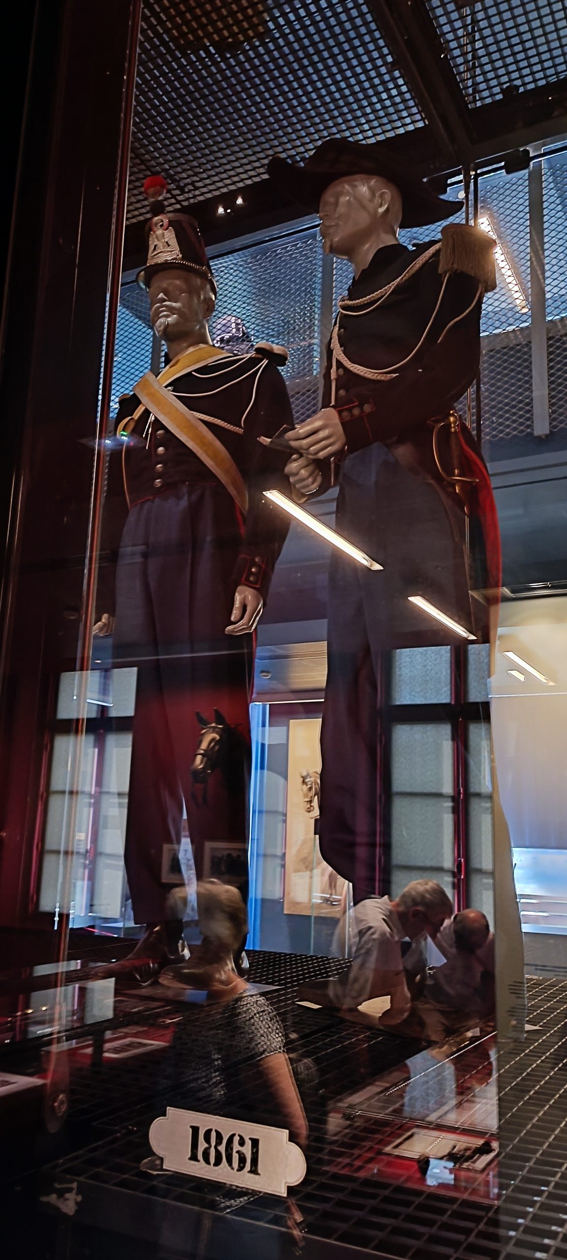Dès notre arrivée, on est happé par cette gigantesque vitrine qui est la plus grande vitrine suspendue d’Europe. Elle meusure 18m de long et 8,50m de haut. Nous découvrons au fil de notre visite l’évolution de l’uniforme, chaque mannequin à son année de référence. C’est quand impressionnant.