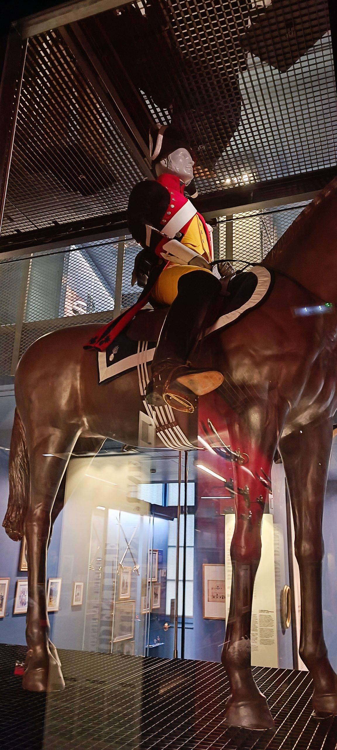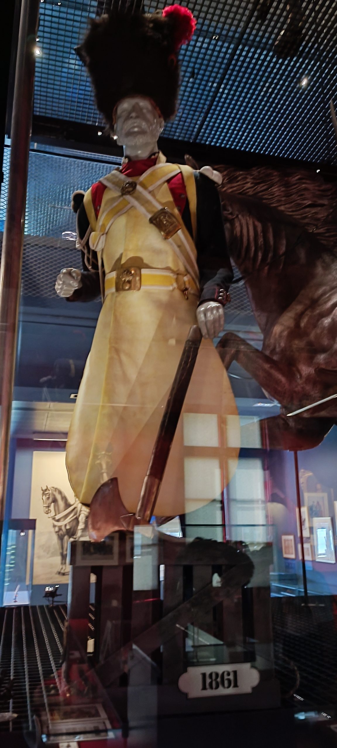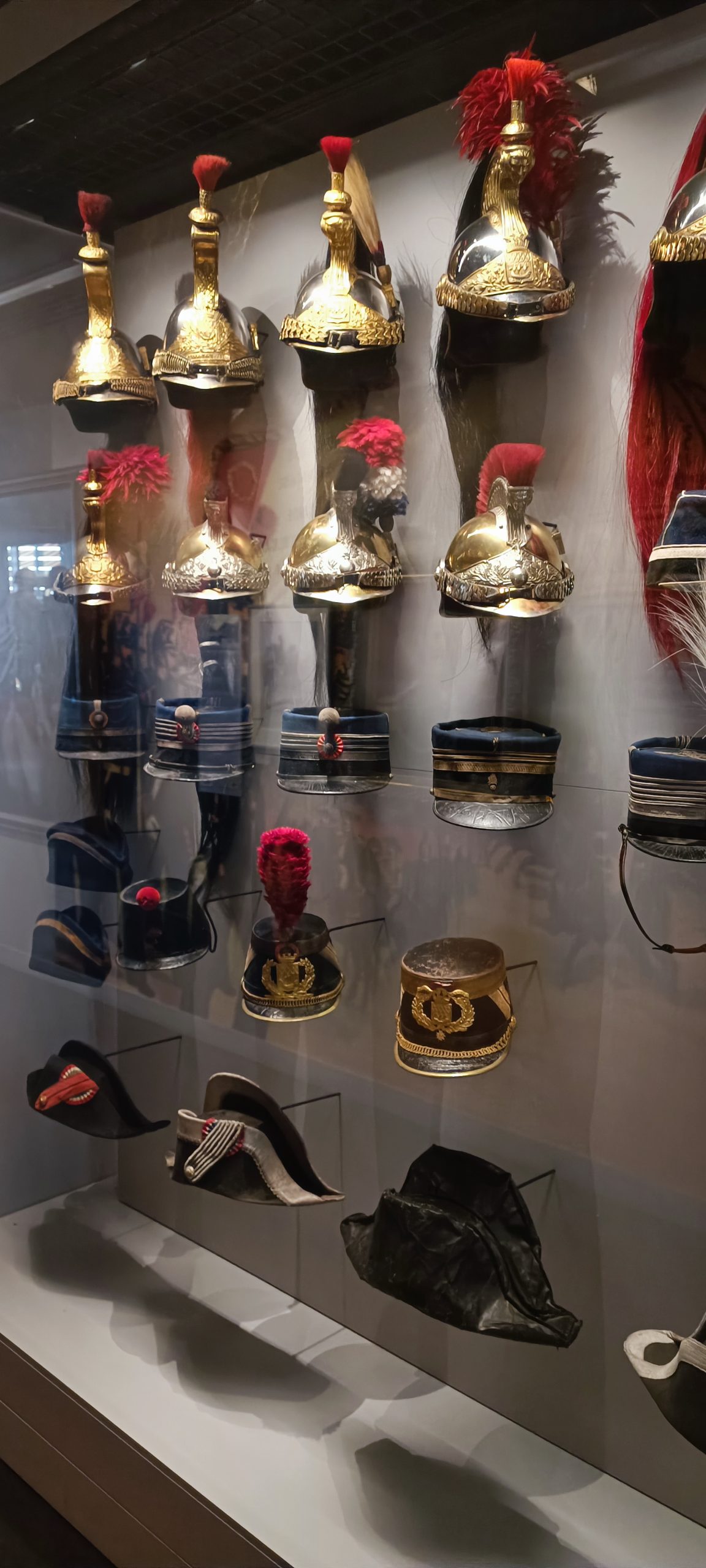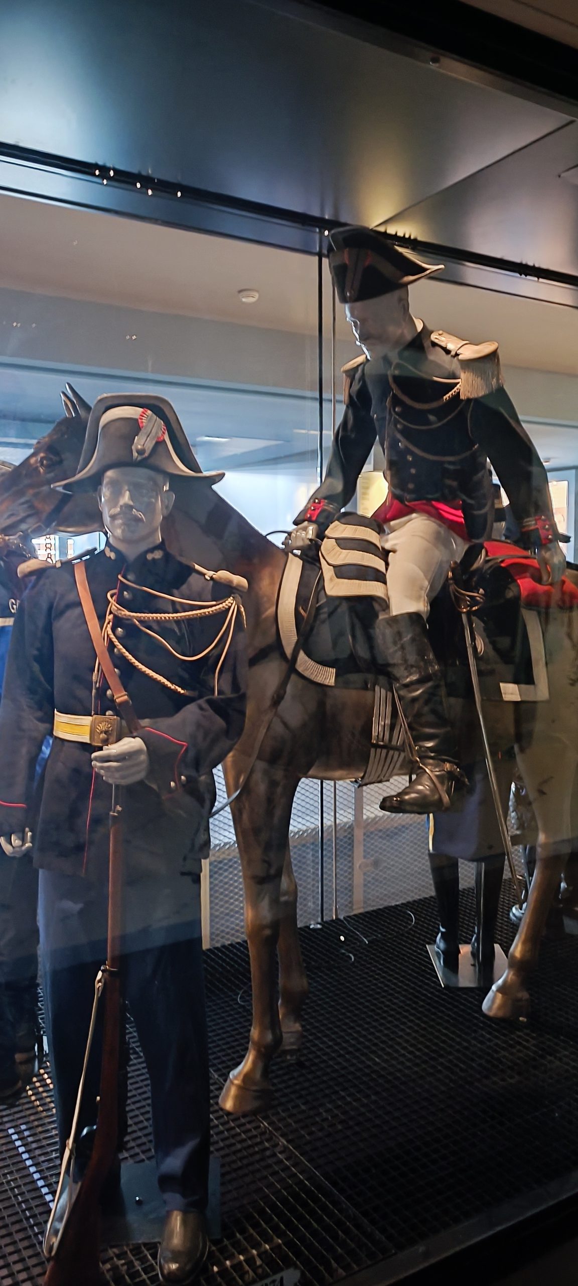 Dès notre arrivée, on est happé par cette gigantesque vitrine qui est la plus grande vitrine suspendue d’Europe. Elle meusure 18m de long et 8,50m de haut. Nous découvrons au fil de notre visite l’évolution de l’uniforme, chaque mannequin à son année de référence. C’est quand impressionnant.