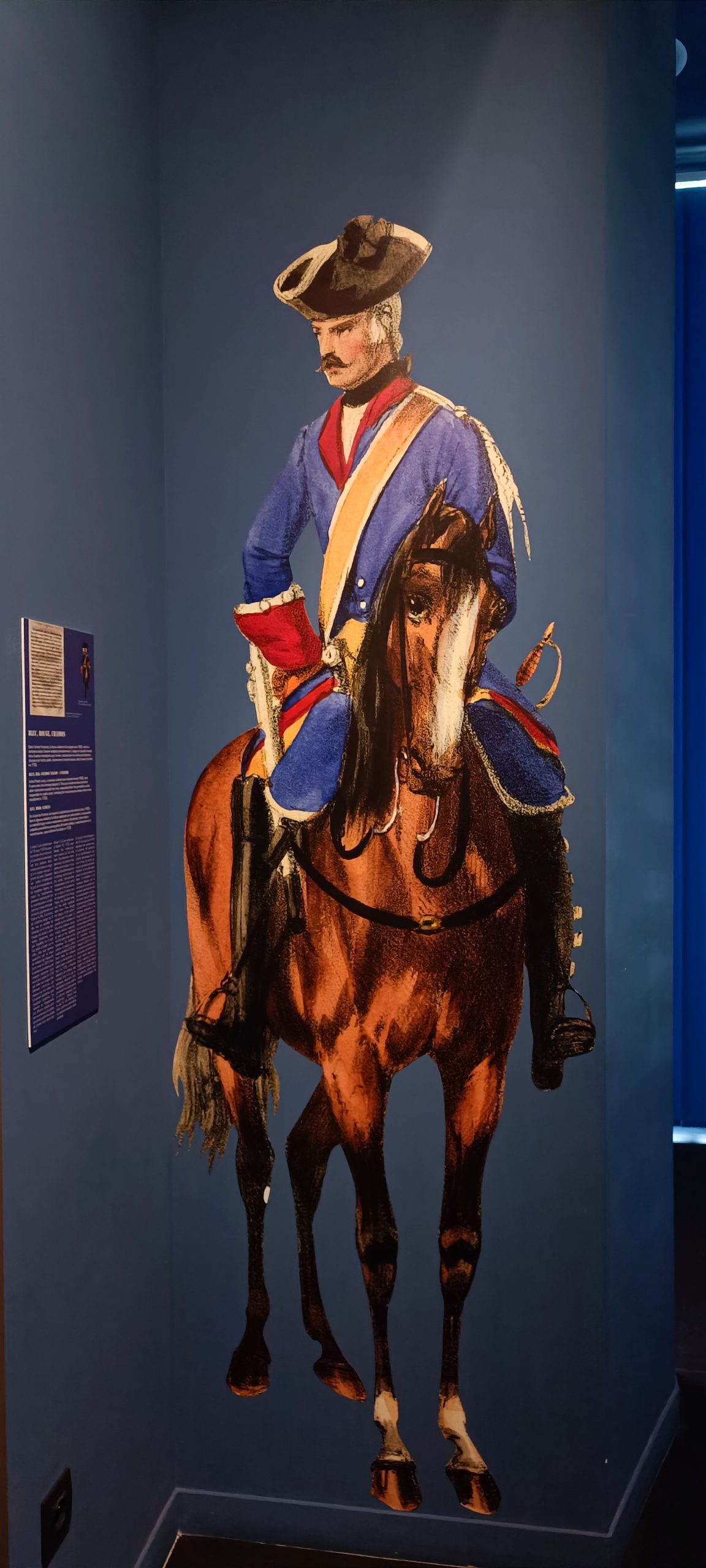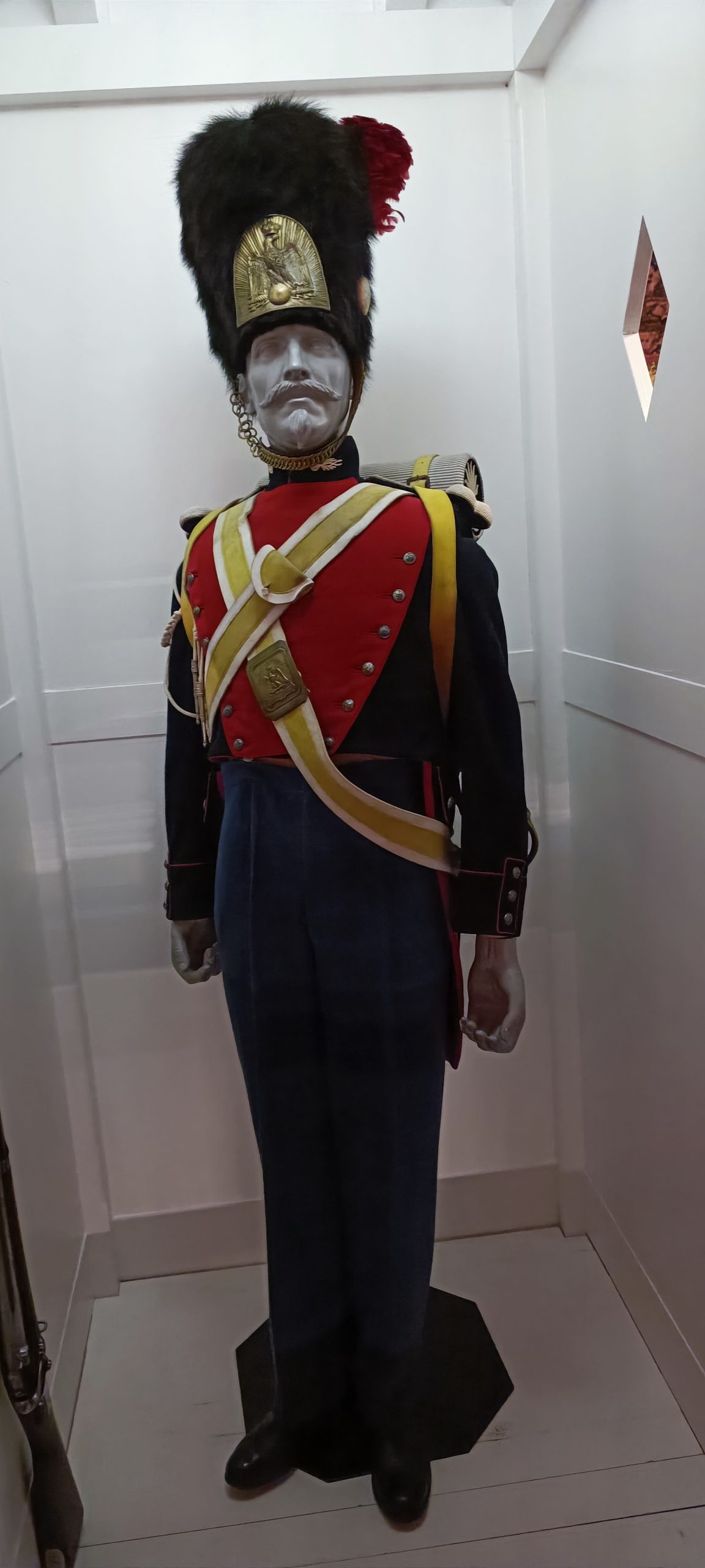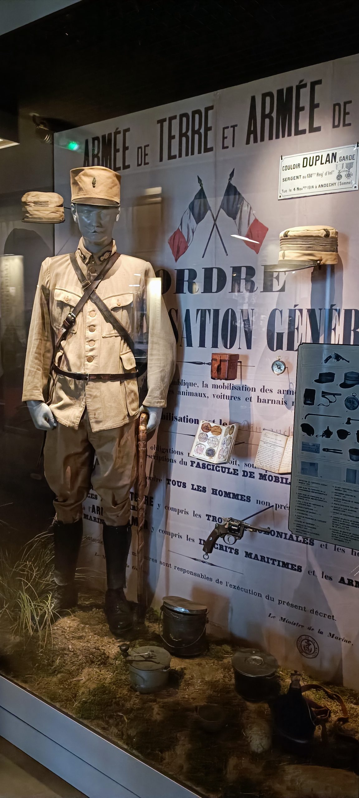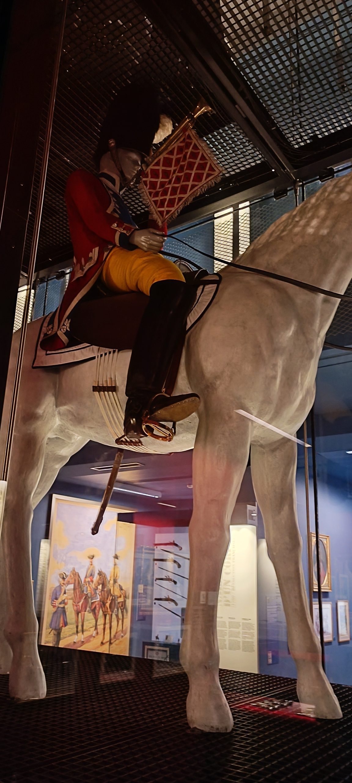 Dès notre arrivée, on est happé par cette gigantesque vitrine qui est la plus grande vitrine suspendue d’Europe. Elle meusure 18m de long et 8,50m de haut. Nous découvrons au fil de notre visite l’évolution de l’uniforme, chaque mannequin à son année de référence. C’est quand impressionnant.