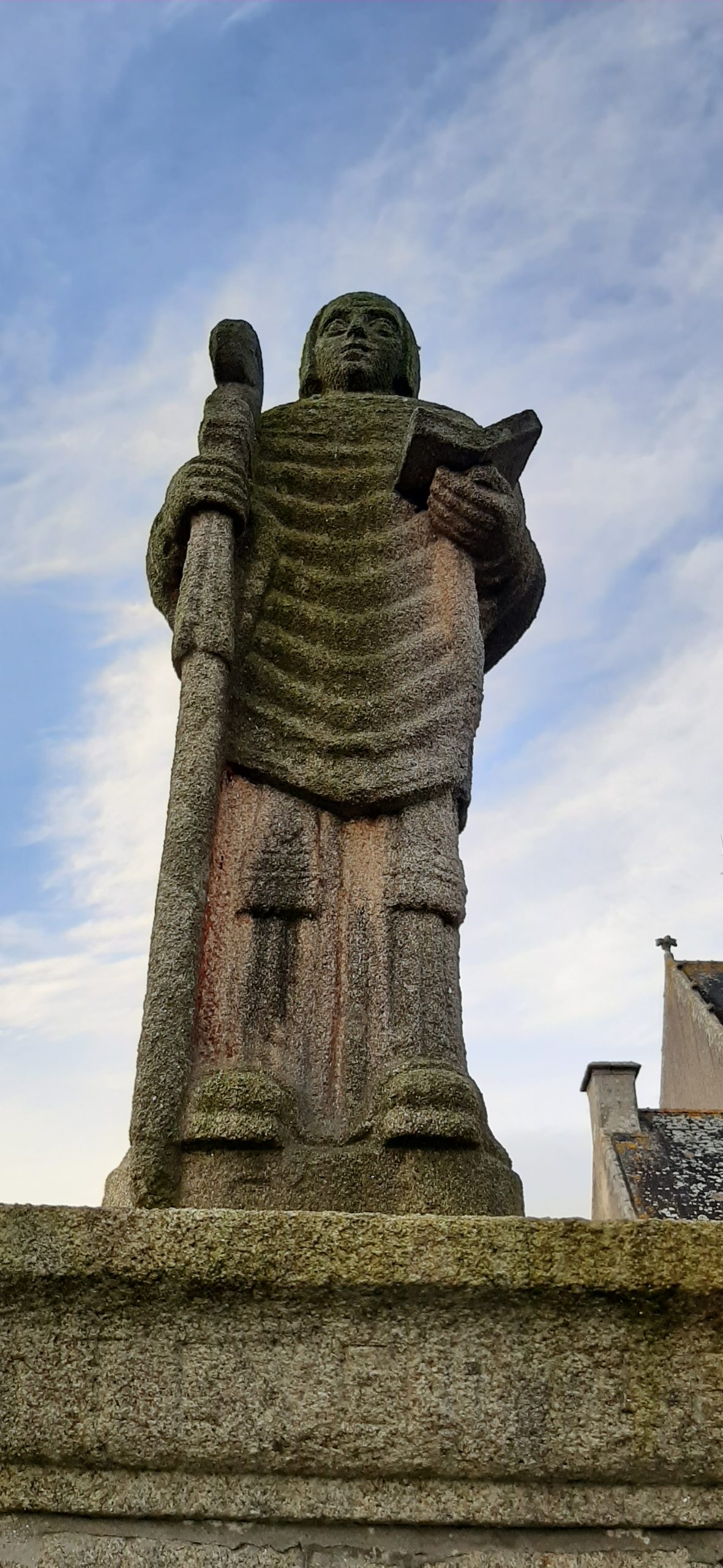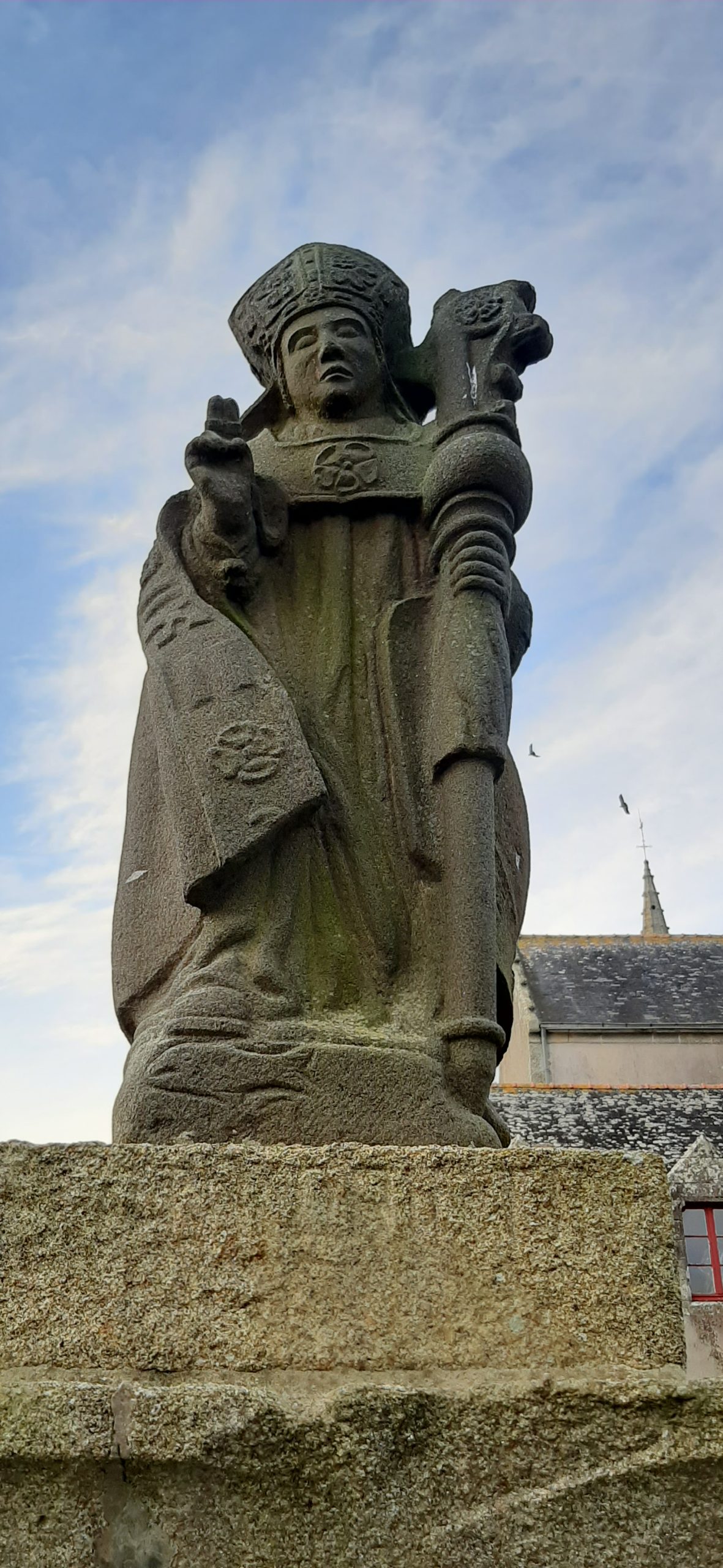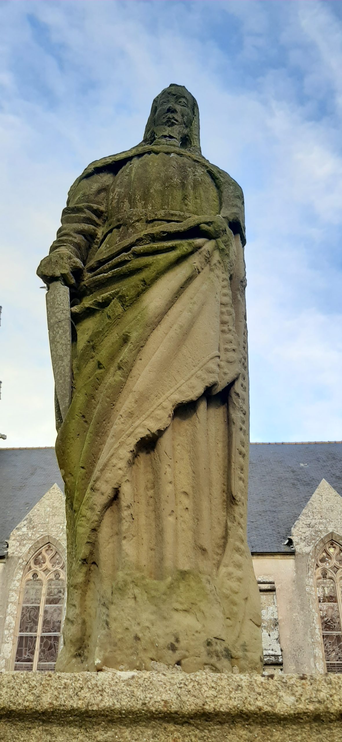 La chapelle se situe au bord de la route au lieu-dit Ste Anne la Palud, un petit parking juste avant l’entrée de l’enceinte de la chapelle. De l’entrée du parking ou de l’entrée qui se situe sur la gauche de l’enceinte avec la porte en pierre, nous sommes accueillis par les Saints, Gwénolé, Corentin, Even et Hervé. Pour chacun une plaque pour nous expliquer qui ils sont.