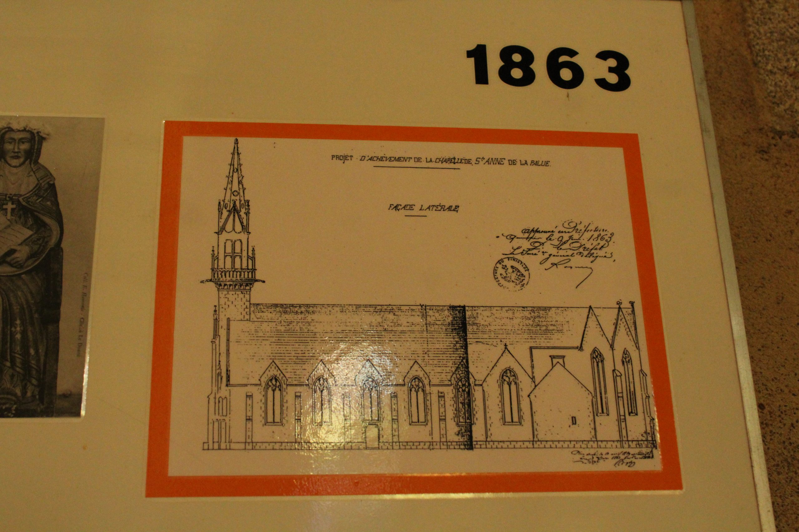 La 4ème et l’actuelle chapelle date de 1858…pour les 1ers travaux. La chapelle en elle-même commença en 1863. Elle sera bénie en 1866. Elle a été construite car la précédente était trop juste pour recevoir les fidèles lors des pardons. La statue de Ste Anne a gardé sa place au sein de cette nouvelle chapelle. On a aussi gardé de l’ancienne, les vitraux du coeur et la cloche Marie Anne. Elle n’a pas cependant la forme qu’elle aurait dû avoir à l’origine. Le recteur de l’époque n’a pas suivi les plans de l’architecte et a donc fait faire les transepts ce qui n’aurait pas plu à l’évêque.
