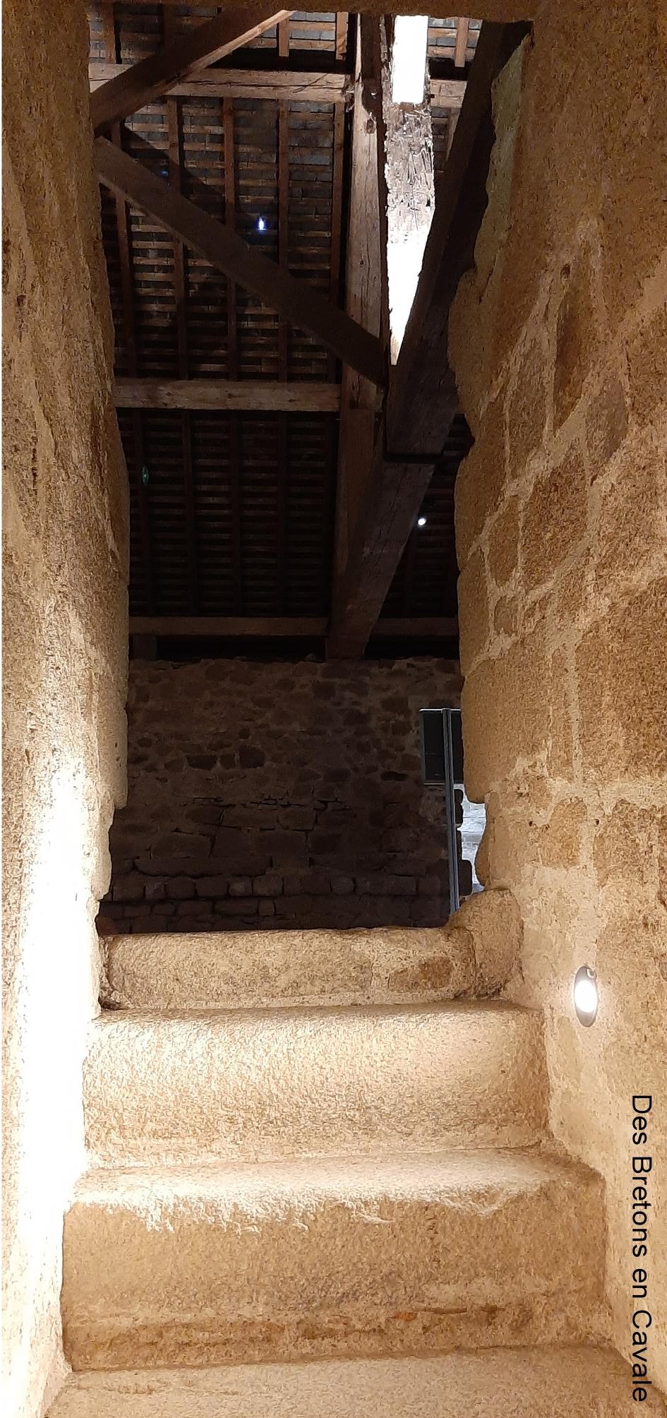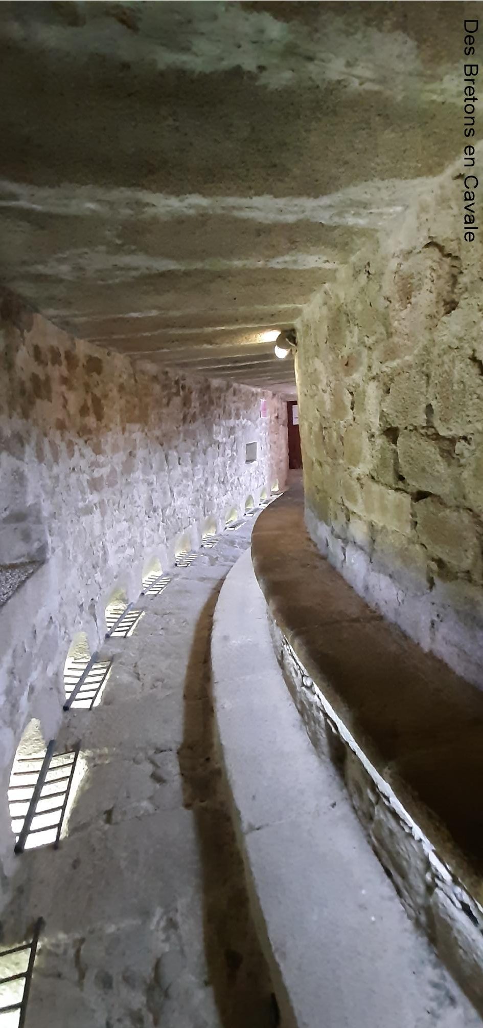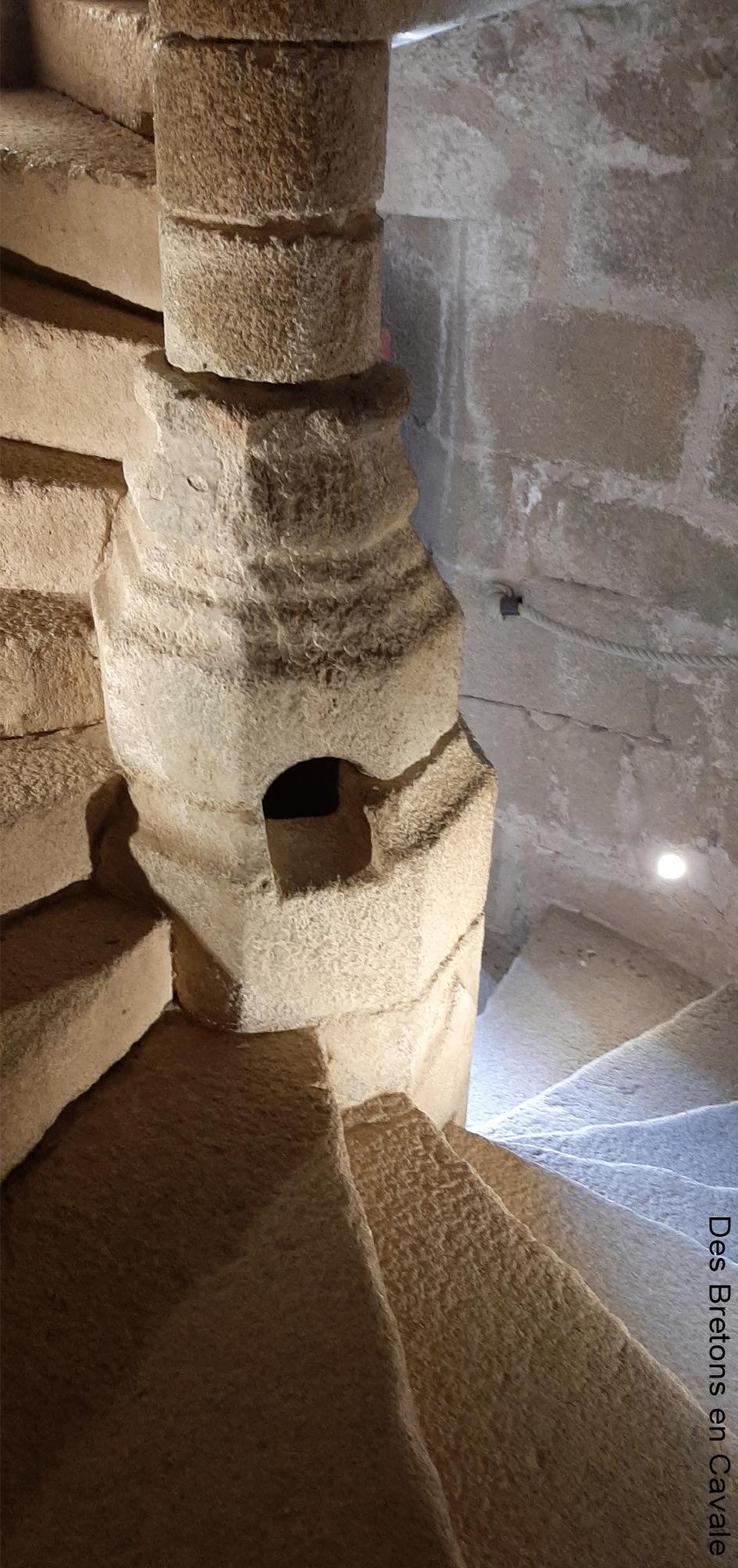 Autre particularité l’escalier en vis à noyau creux. Si l’escalier en vis est typique du Moyen Age, le noyau creux est beaucoup plus rare. Il avait une fonction d’éclairage avec l’aide de miroirs qui renvoyait la lumière. C’était intelligent quand même n’est-ce-pas?