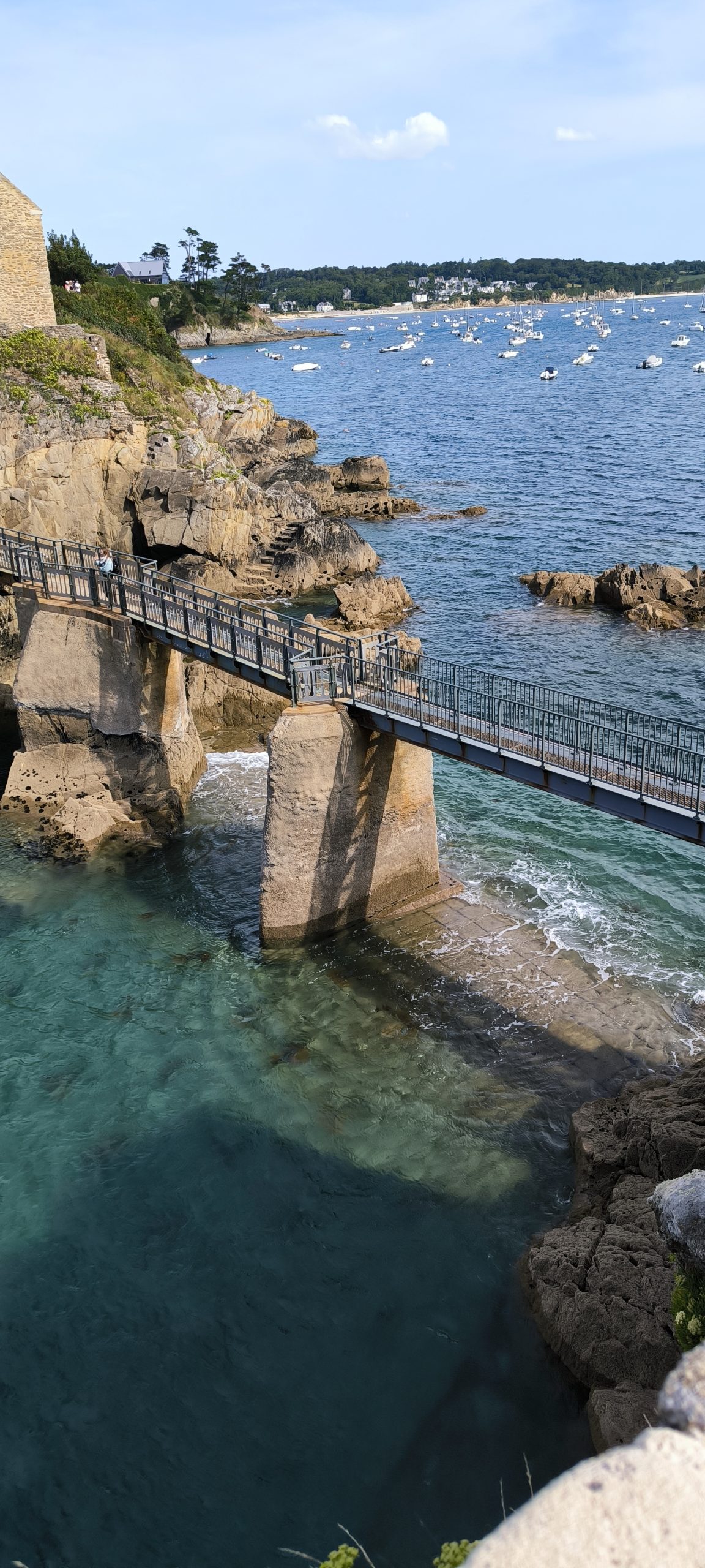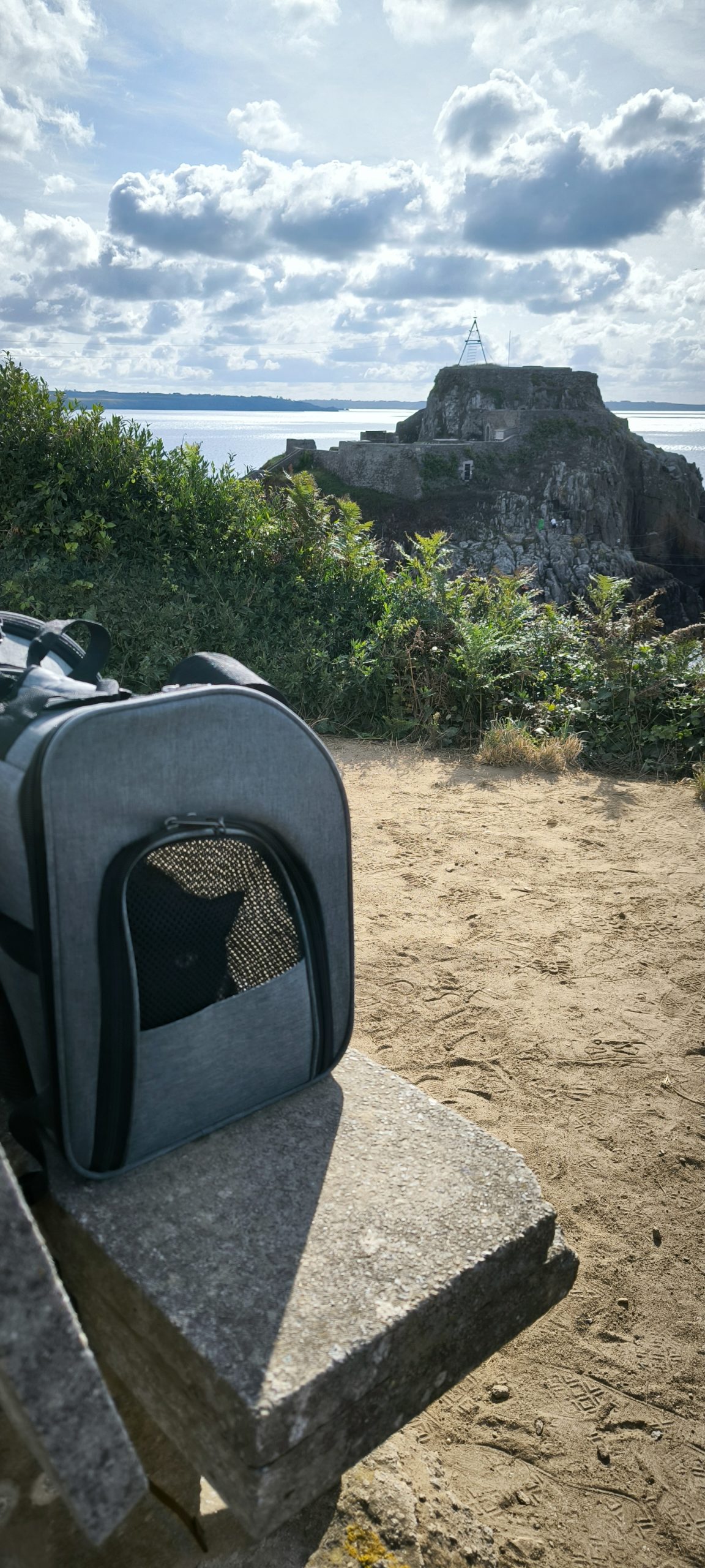 Après ma visite du bourg, on s’est dirigé vers le fort de Bertheaume à Plougonvelin. Étant un peu en avance sur l’ouverture, j’ai mis le chat dans le sac à dos et on est descendu à la plage et on a fait un tour sur le sentier côtier. C’est une fois entrée que j’ai vu que les animaux étaient admis donc elle aurait pu venir avec moi.